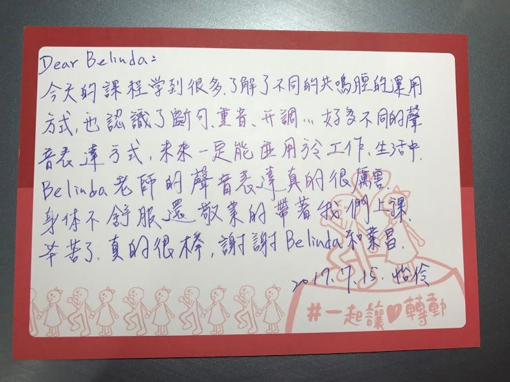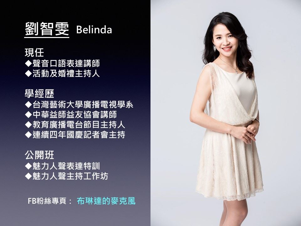 本次聲音表達課程特別邀請專業『聲音表達訓練師-Belinda』來教大家如何改善單調無節奏聲音,強化說話時的停頓、節奏、音調起伏、聲音畫面,讓聲音更能清楚傳達意念,增加人際溝通表達能力!