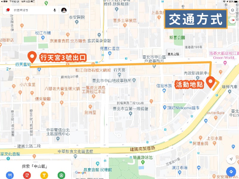 .地點:Terminal C(台北市中山區建國北路三段 92 號 2F,捷運行天宮站)