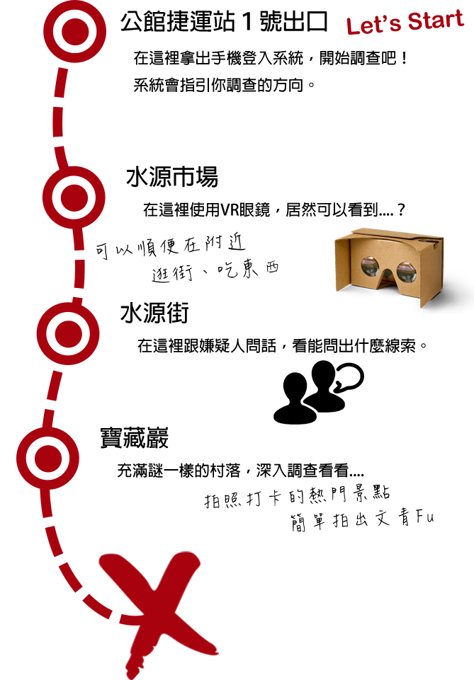 ◔ 收到謎題包後,請與同伴相約於台北市公館捷運站1號出口集合,開始遊戲。