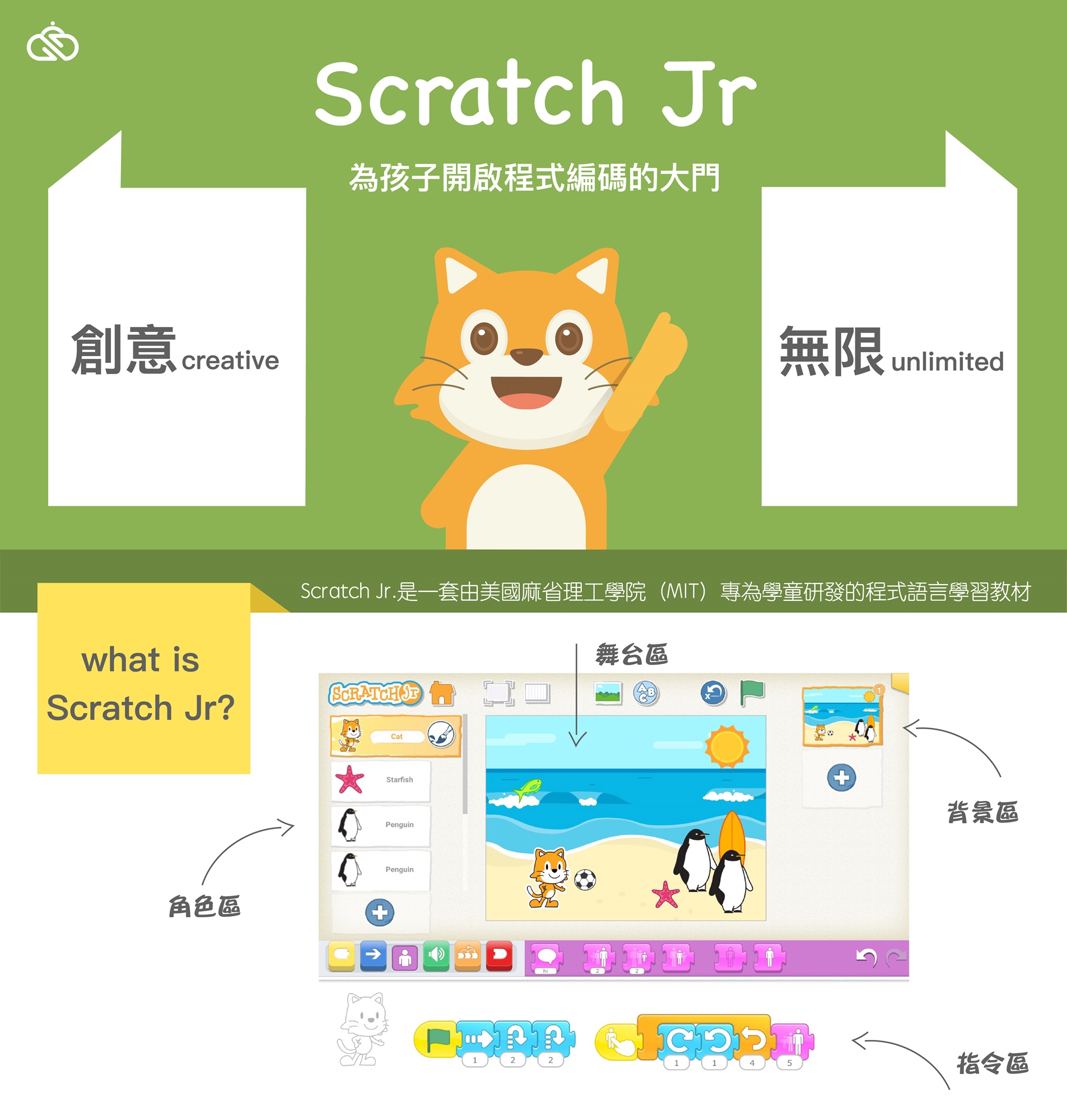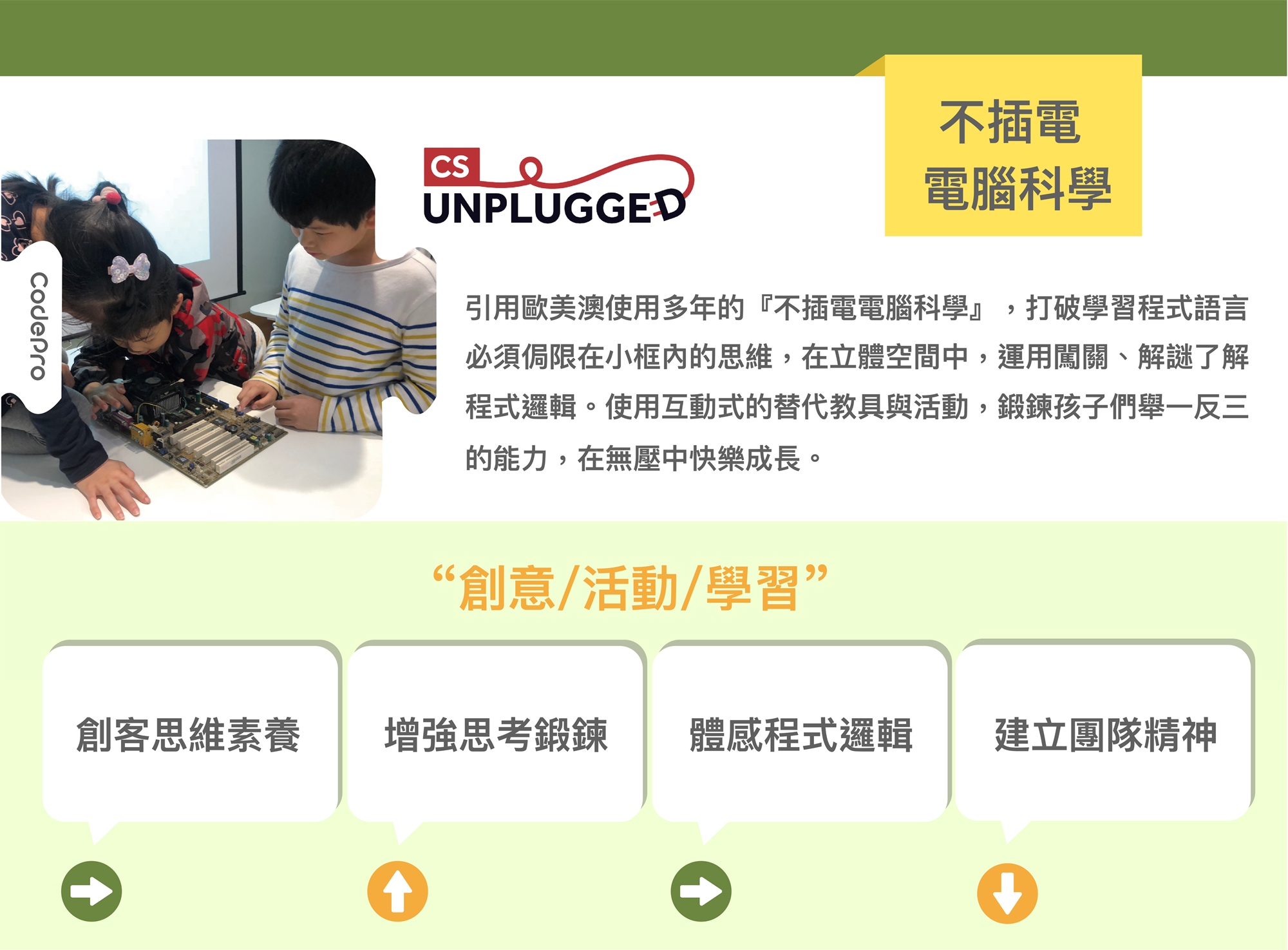 特別使用平板做為學習平台,以幼兒的肢體協調與視力發展所做貼心設計,取代基礎認知的文字,運用圖像、符號與積木方式為孩子開啟程式編碼的大門。CodePro讓孩子『親身體驗』何謂電腦邏輯、編寫指令時所需的基本觀念、重要的電腦基礎構造、網路通訊協定。孩子以輕鬆、好玩的Google不插電電腦科學活動方式連接生硬的電腦知識,就連複雜的程式演算法概念都能以活動的方式快速了解 !