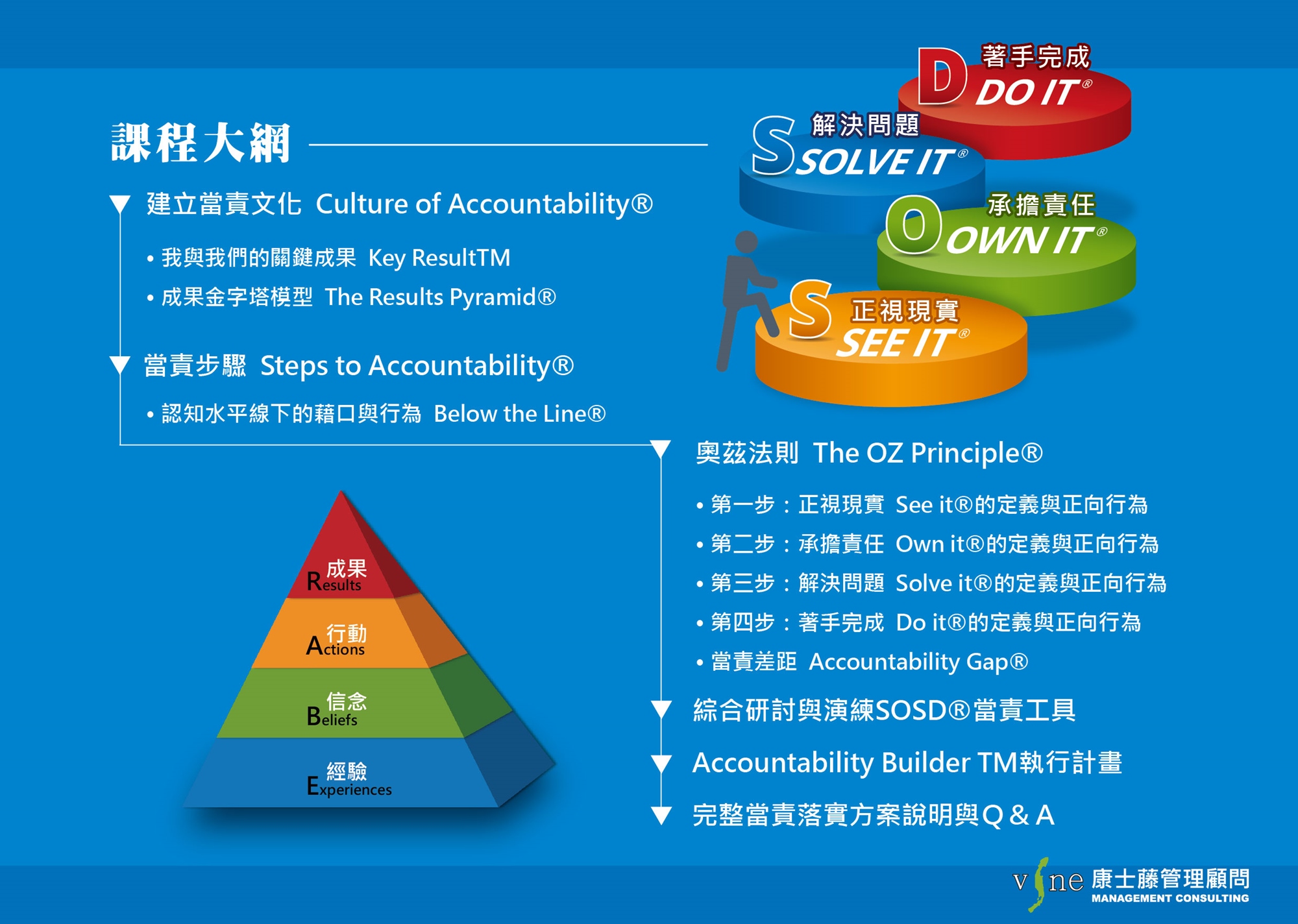 「年復一年,我們的客戶(全球500大)將公司的成功歸因於我們在其內部協助推行的"當責文化"。因為我們的課程與工具深植於客戶的流程與系統,我們成為長期的合作夥伴,一起完成公司任務。」