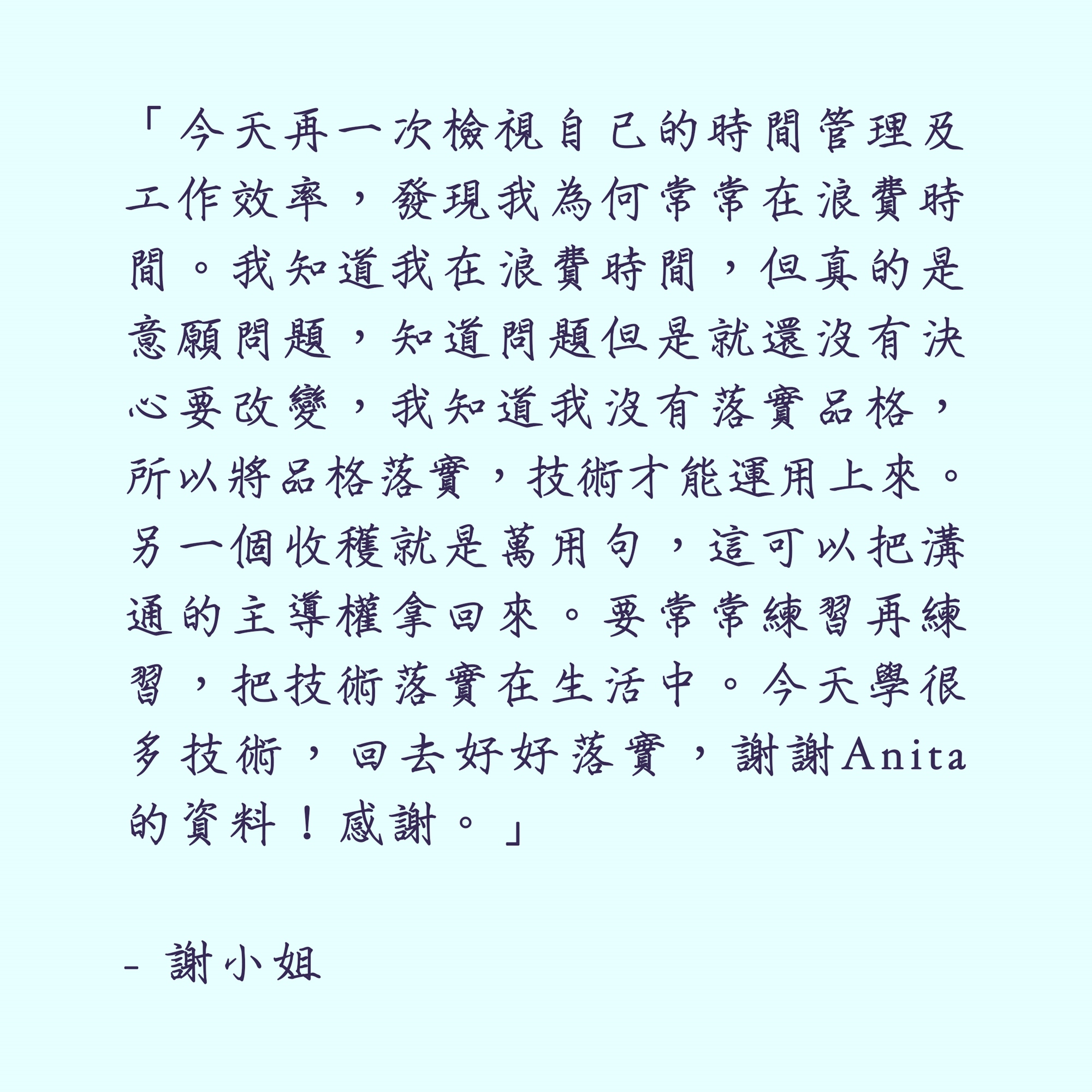 ➲ Anita企業教練,累積一對一諮商輔導超過數千小時,熱衷於知識培訓、人才養成、教練人們輕鬆運用所學、享受學習的樂趣,並進一步優化生活、工作與企業管理,已經協助超過千人,完成目標實現夢想。