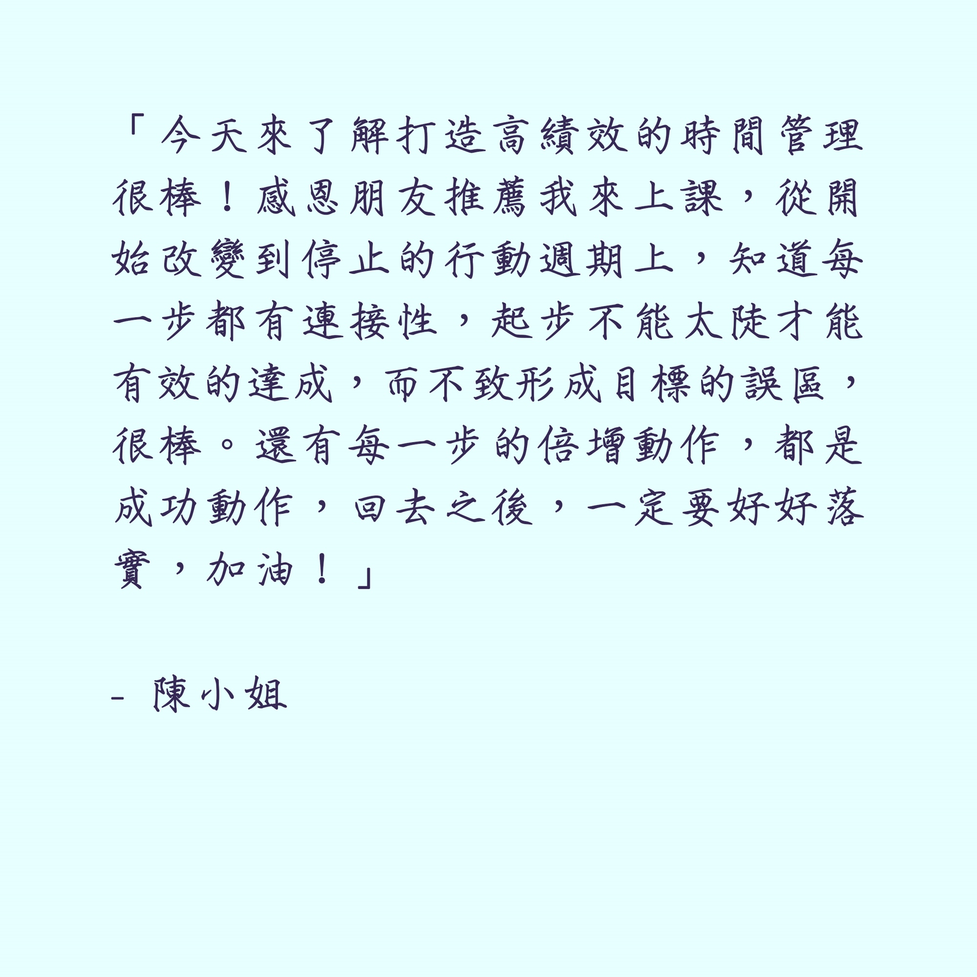 ➲ 協助過培訓與輔導的企業包含:花旗銀行、台灣人壽、微軟電腦、Gucci、傑太日煙國際(JTI)、中環、永興軸承、環泥建設、大聯大控股、南山人壽、三商保全、亞太淨水企業、中華職棒聯盟、全真補習班、利隆食品有限公司、五泰房屋連鎖、住商不動產、台灣必治妥、黛安芬、Viva電視購物台...等。