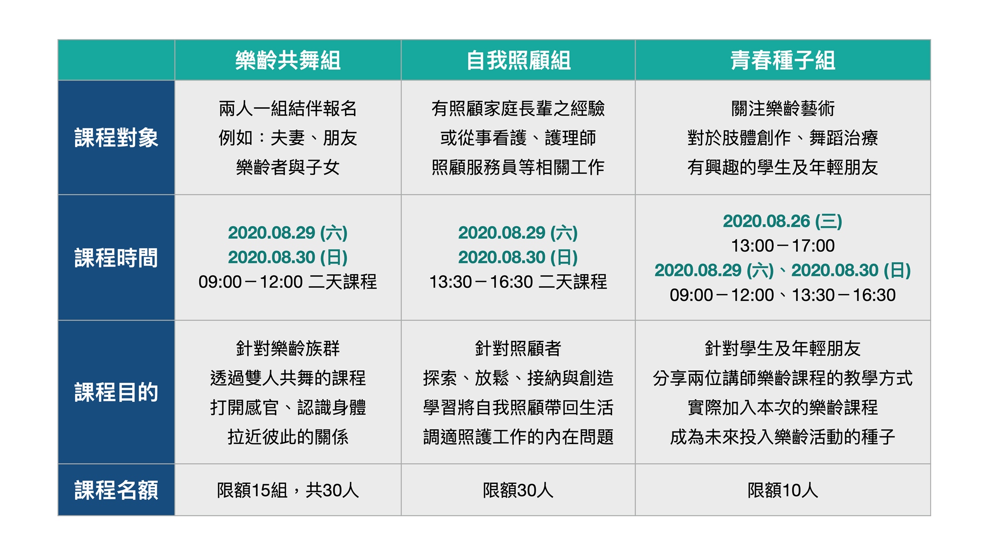 透過舞蹈,拉近人與人之間的距離,打開身體的活動並置入感知,察覺自我更關注於他人。此工作坊以推廣舞蹈及促進共融藝術為目標,我們針對不同的族群進行課程規劃:(A) 樂齡朋友、(B) 長期需要照護長輩的工作者、(C) 年輕學子,以不同的面向延展我們對於此議題更多觸角的投入與關注。