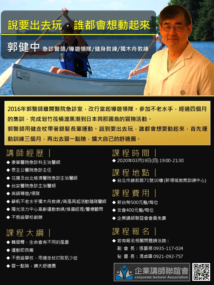 【企業講師聯誼會 3月19日(四) 19:00-21:30 郭健中 老師--說要出去玩,誰都會想動起來】