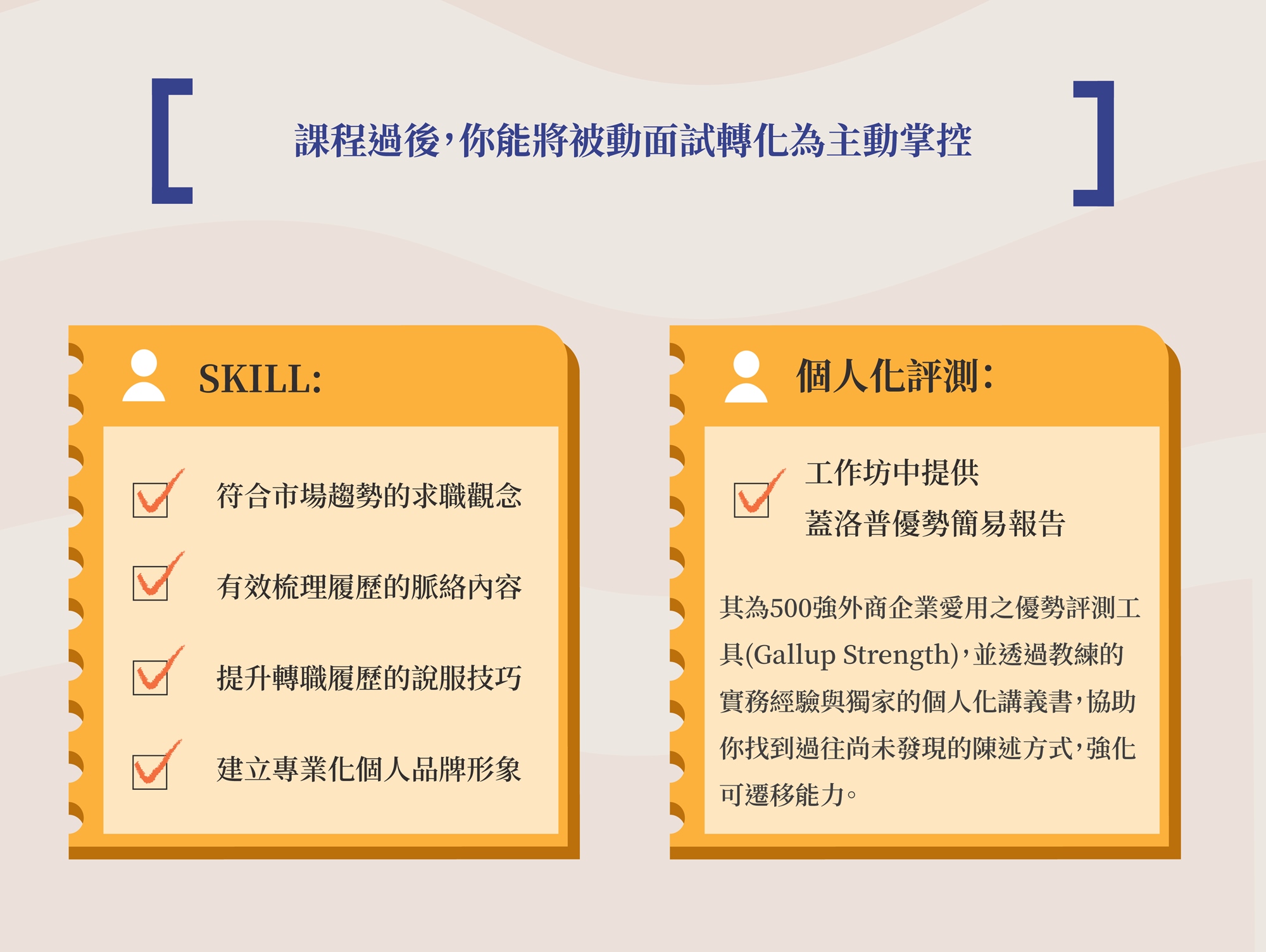 - 一對一職涯諮詢:請於開課日期後2周內完成職涯諮詢預約