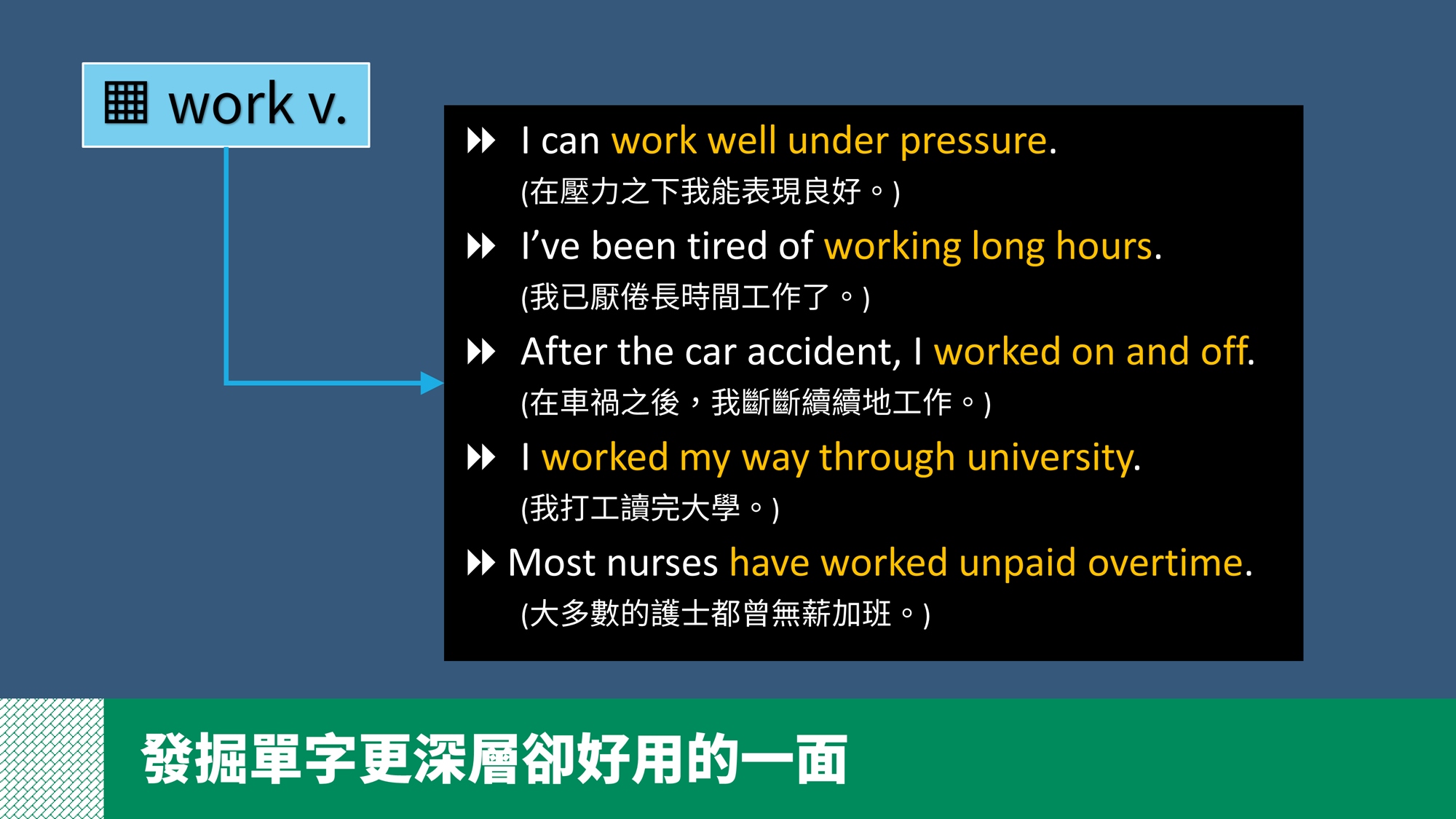 - 避開老掉牙的說法、學會令人耳目一新的用語:(1)緊張就只會nervous嗎?參考:I got into a real state before the interview.、(2)我喜歡挑戰。只會用challenge嗎?給你在下次求職面試時,讓面試主管誇你英文不錯:I enjoy being at the sharp end.
