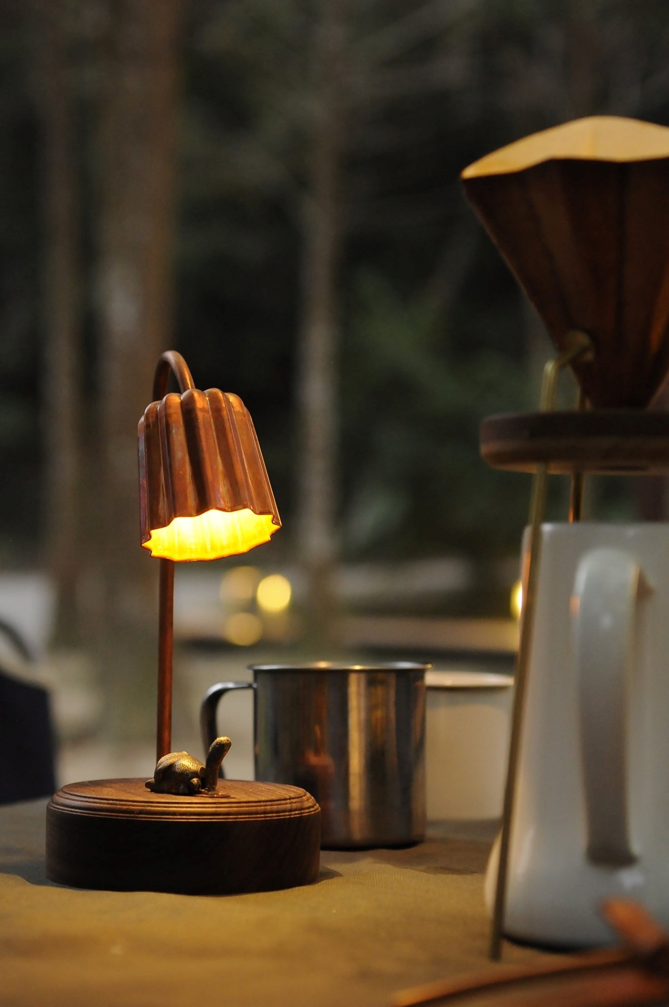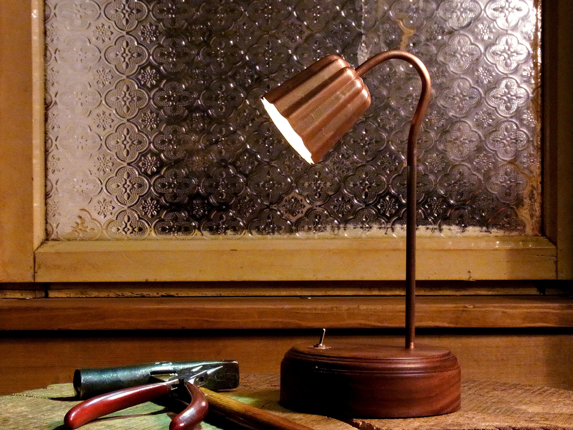 材質:紅銅、胡桃木、LED燈泡、電線、3號電池