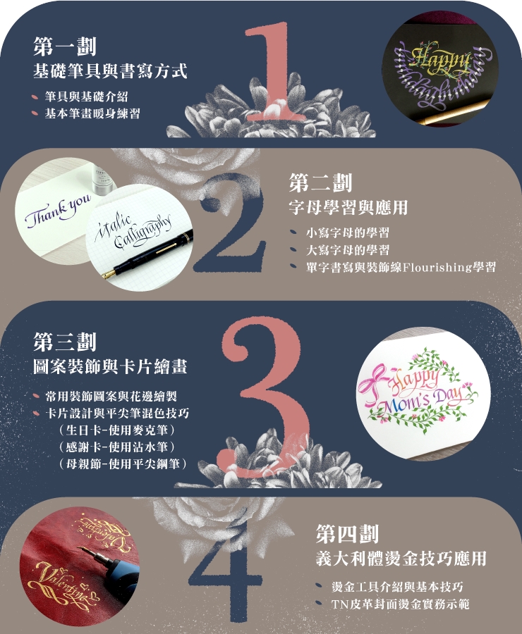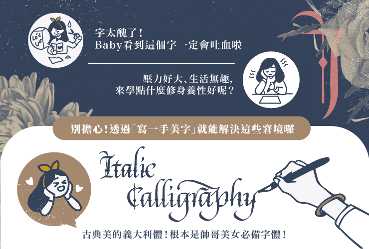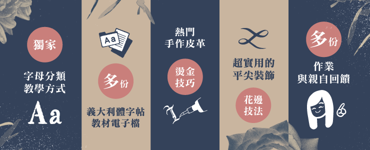 具有古典美以及立體感的『義大利體(Italic Calligraphy)』是平尖筆當中最適合新手入門學習的字體,有別於都是直線較剛硬的哥德體,義大利體運用的是平尖的曲線技巧,字體優美易讀,不管是書寫短文或是卡片都非常的合適!是一個極容易上手又具備極大發揮空間的字體。