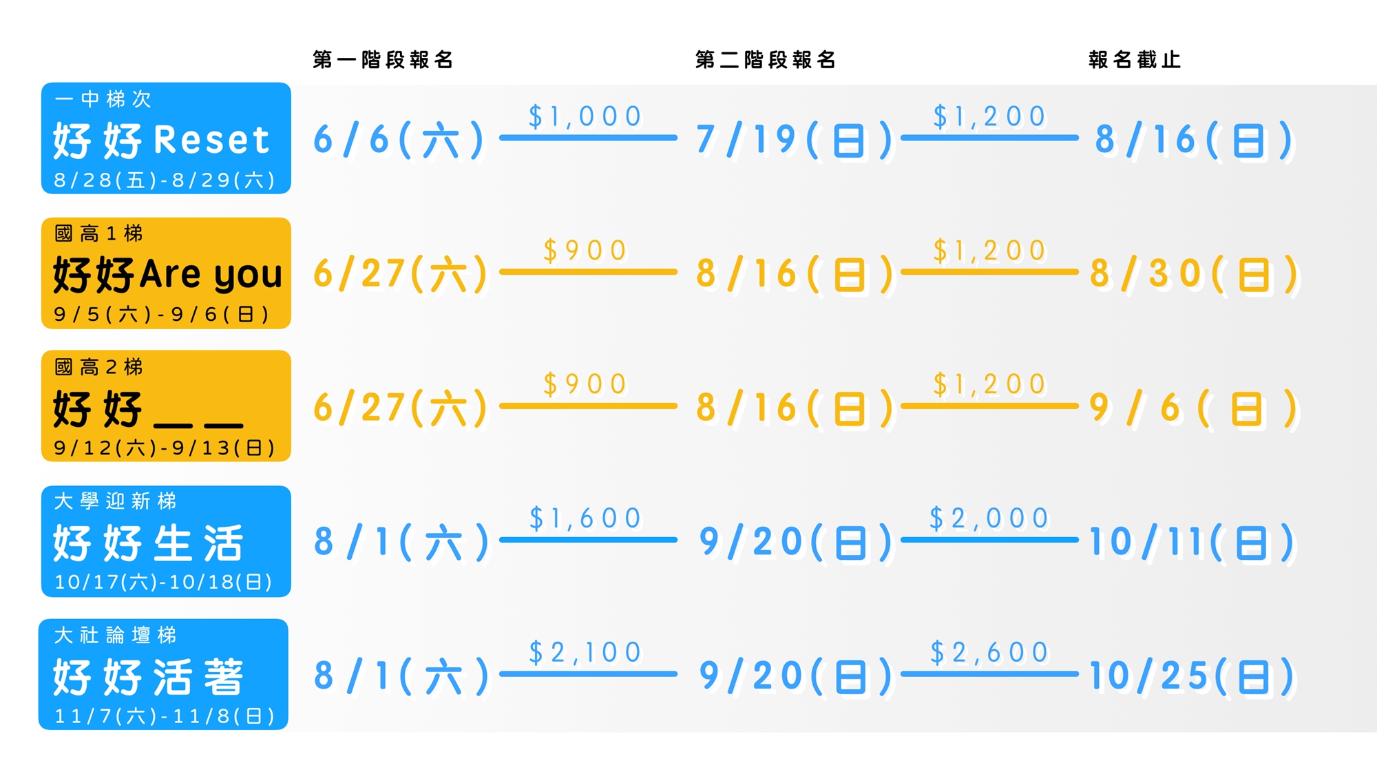 (費用包含:餐點、場地、交通車、保險、活動設備、中部-好好__ &中部-好好are you含T-Shirt、北部-好好呼吸&中部-好好生活含住宿…等)