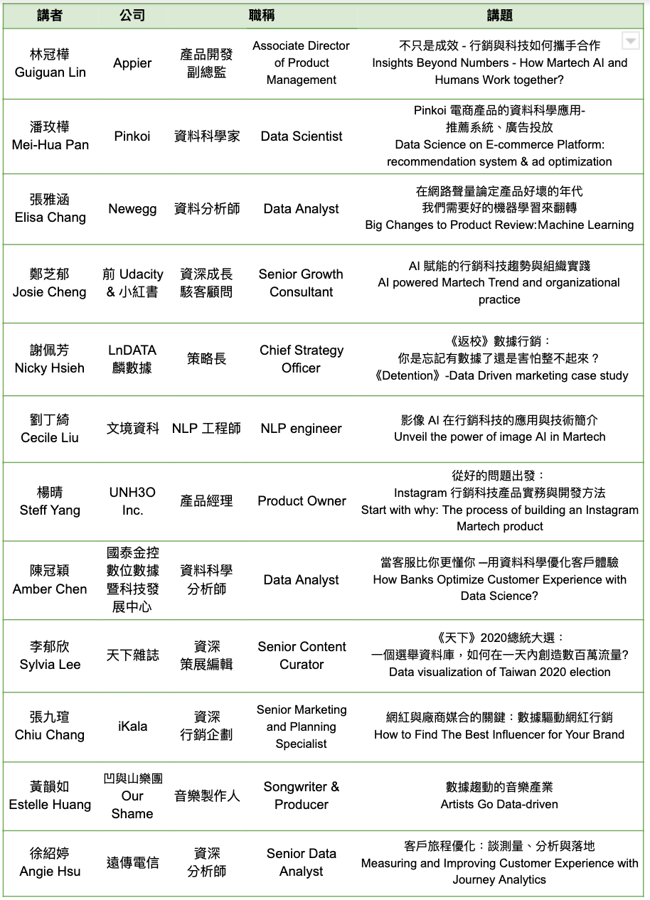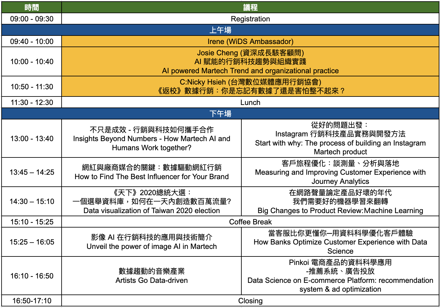 今年在台灣將舉行第三屆 WiDS Taipei Conference,活動中邀請聚焦在台灣業界的熱點話題「行銷科技(Martech)」,邀請到業界擁有豐富實務經驗且深耕多年的女性專家,分享業界第一線數據驅動行銷 Data-driven Marketing 的經驗與見解,同時也提供各領域人才現場交流的機會。(※此活動不限性別)