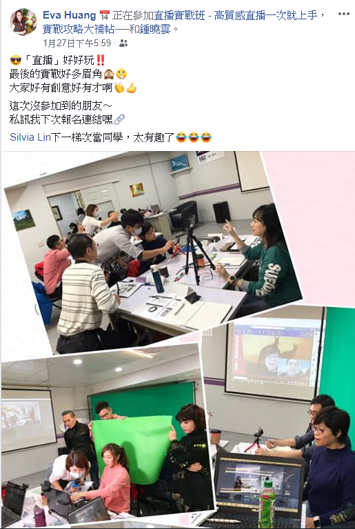 2017年起開立「直播實戰班」公開班課程,並且在多個企業與公家單位授課並擔任執行或輔導顧問,將直播技術應用至企業品牌、行銷、銷售、內容等多個面向。累計直播場次超過500場,時數超過1000小時。