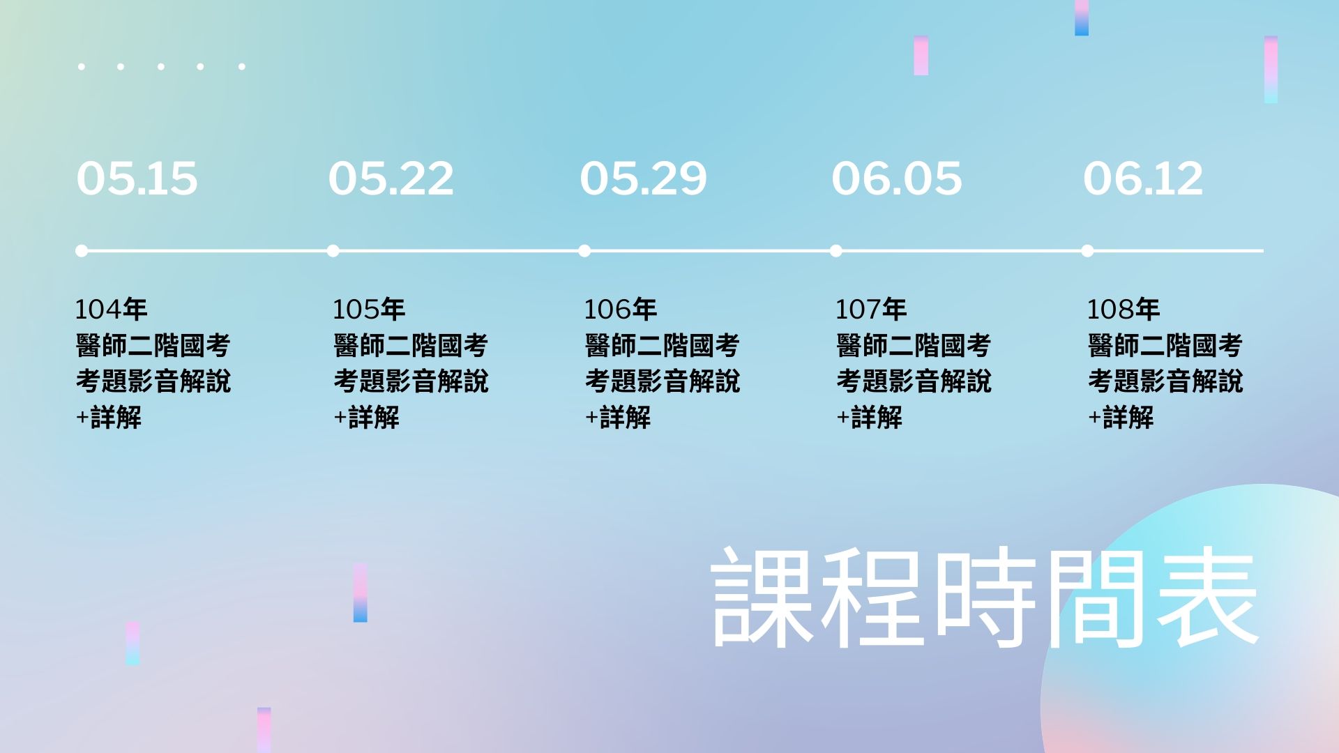 - 課程內容包含104-108年共五年歷屆試題(7月份)詳解,每年320題 (80題 x 4科)總共1600題的影音講解