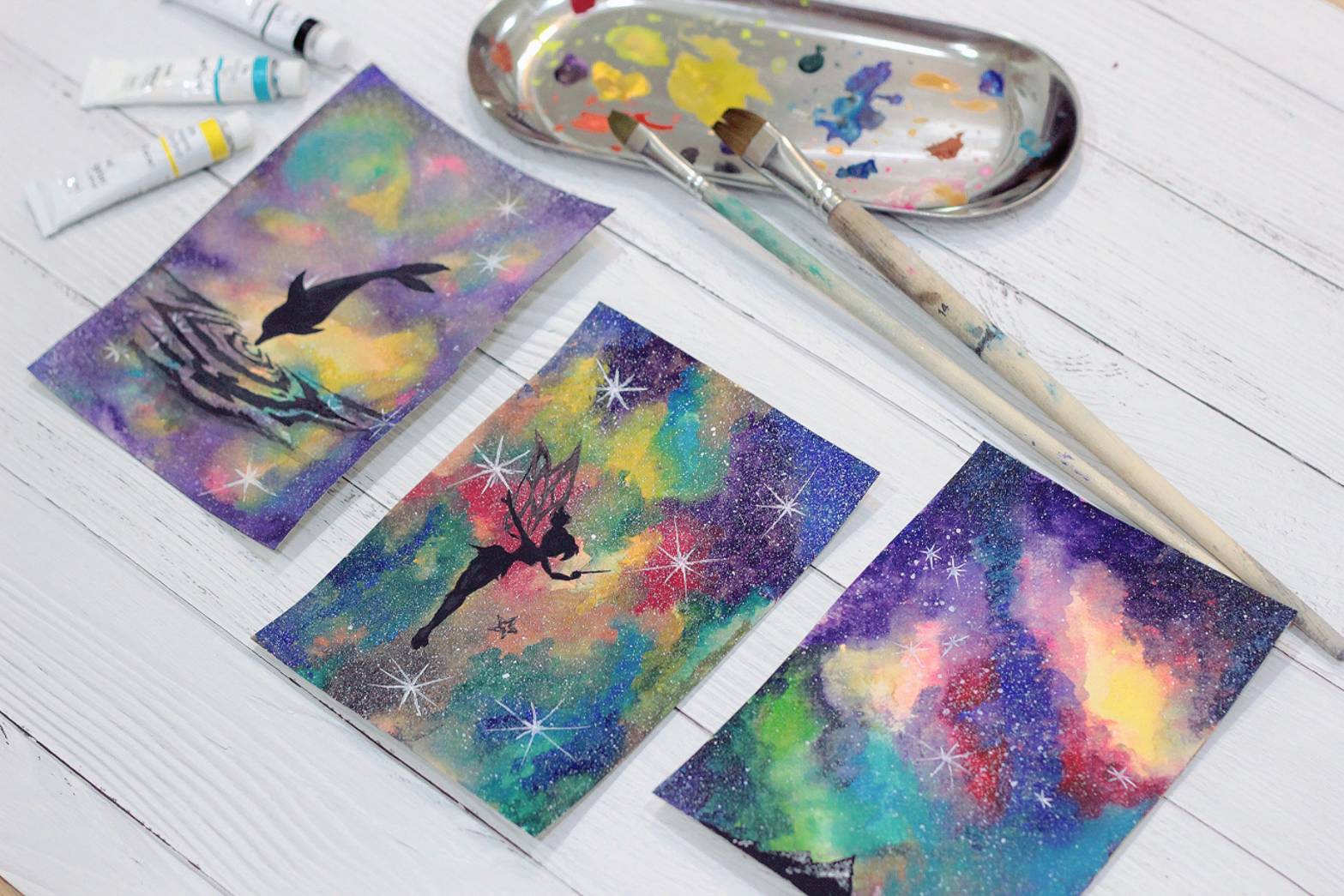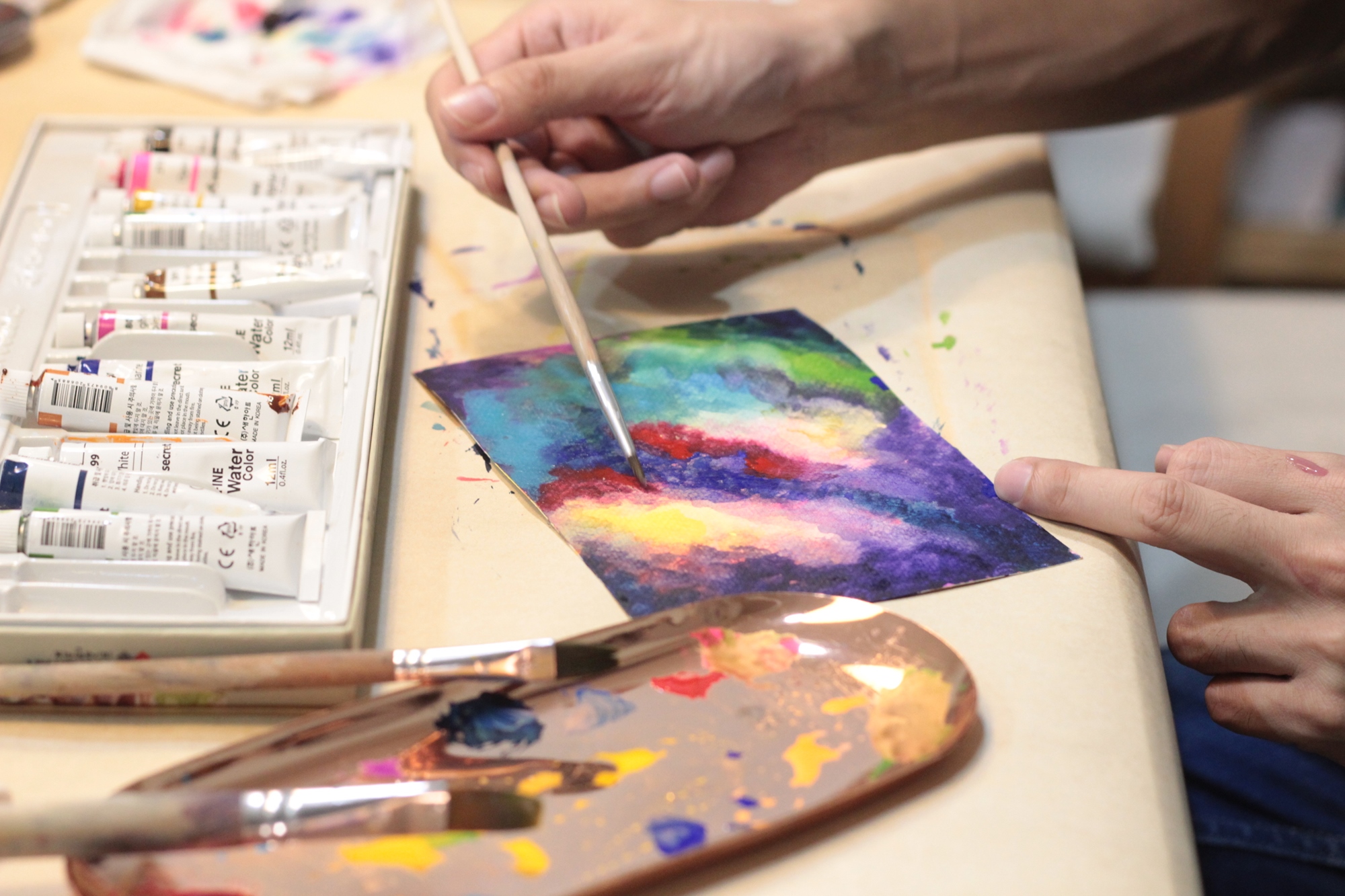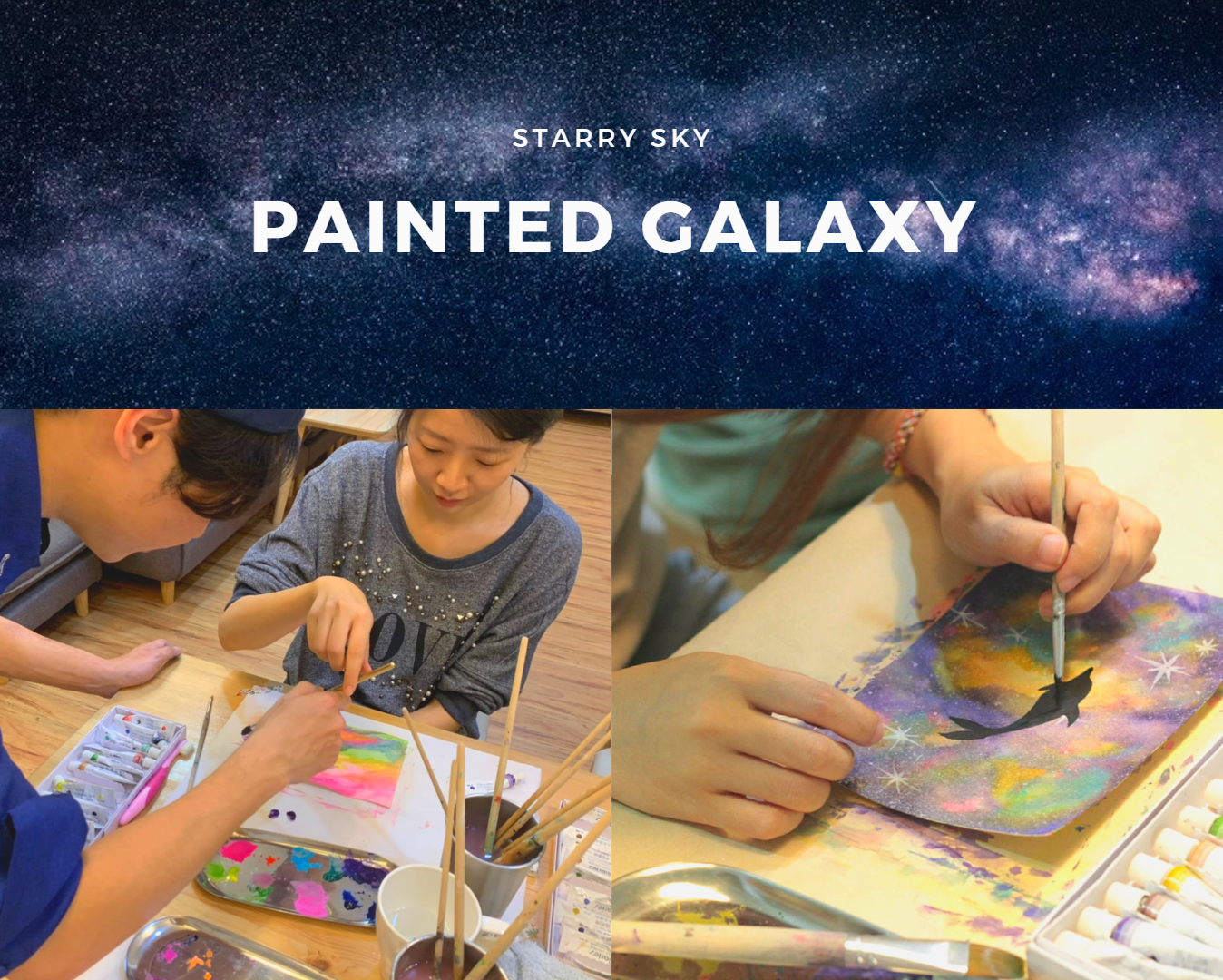 星空是一個蘊藏無限可能以及無限希望的美麗宇宙,從自己的手中畫出屬於你心中那片星空。水彩手作老師,會細心講解流程並教導作畫簡易技巧,讓不會畫畫或是第一次畫畫的人,都可作出令人驚豔的星空畫作。