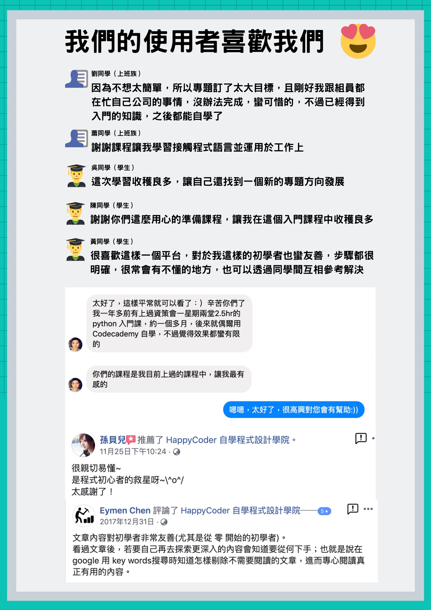 HappyCoder 自學程式設計學院是一個自學程式設計(Programming)、電腦科學(Computer Science)交流學習社群,團隊成員擁有台大等一流學府資訊相關科系及知名上市科技與知名網路軟體新創公司業界資深工程師背景。我們致力於推廣學習程式設計運算思維和解決問題的能力,過去已成功輔導三千多位學員跨領域自學程式設計。希望透過自學程式設計培養學員學習跨領域知識的自學能力!