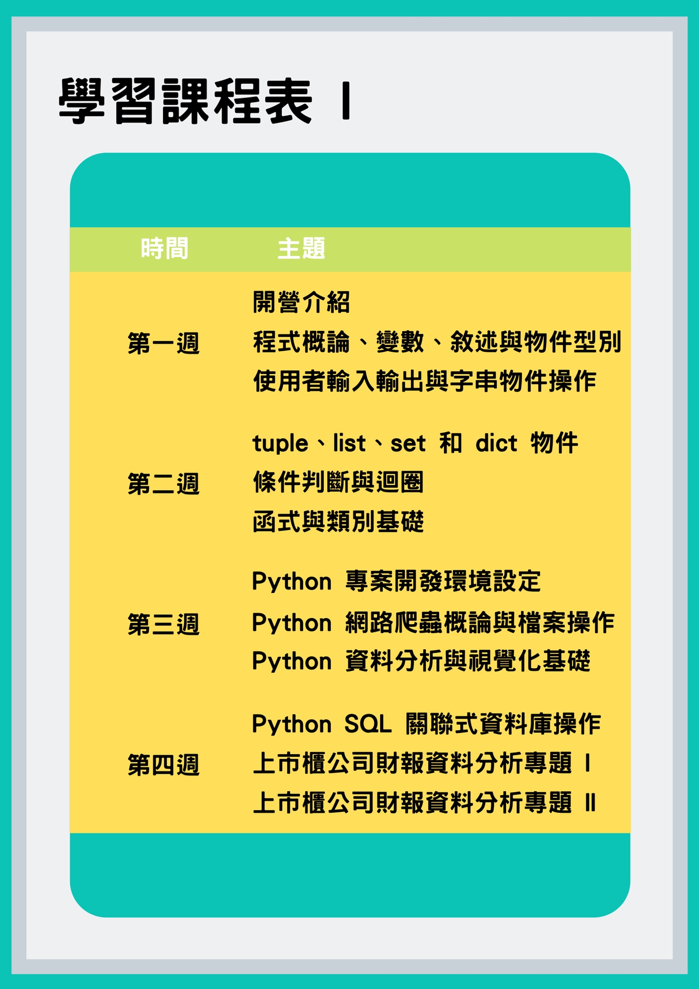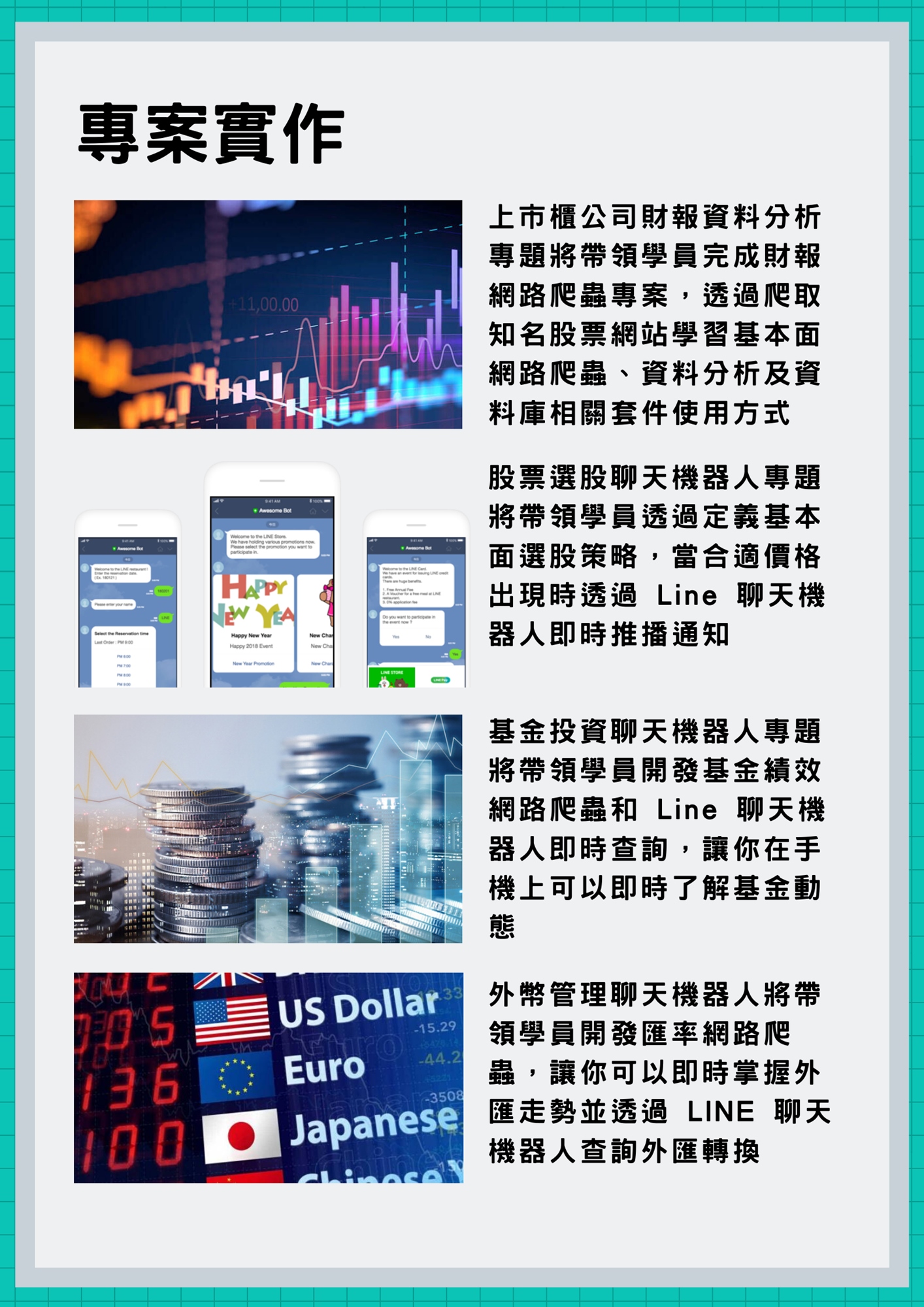 - 學習財報網路爬蟲選股和股價昂貴價和便宜價估算、Python 自動化操作 Excel CSV、Python SQL 關聯式資料庫操作、Python 資料分析與視覺化、Line 聊天機器人基礎、Google Spread Sheets 資料儲存等應用開發能力