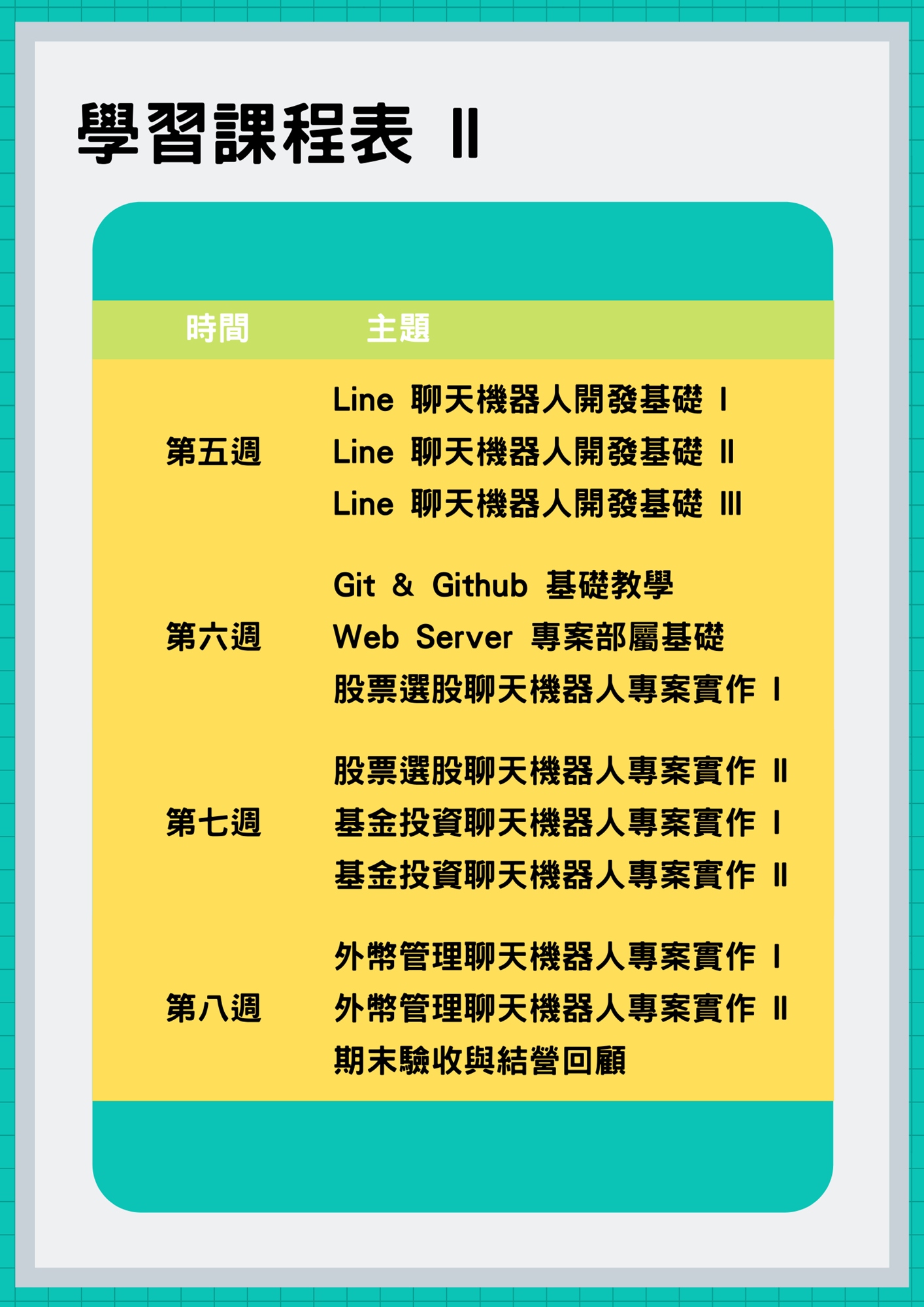 - 本共學營課程內容主要在 Python 投資網路爬蟲、聊天機器人程式設計及基本面和籌碼面證券投資分析,不適合想要學習技術面及程式交易的學員