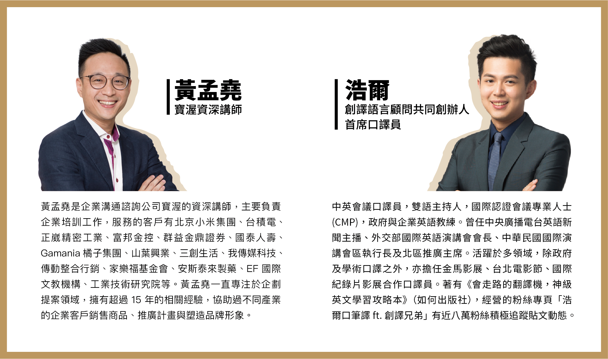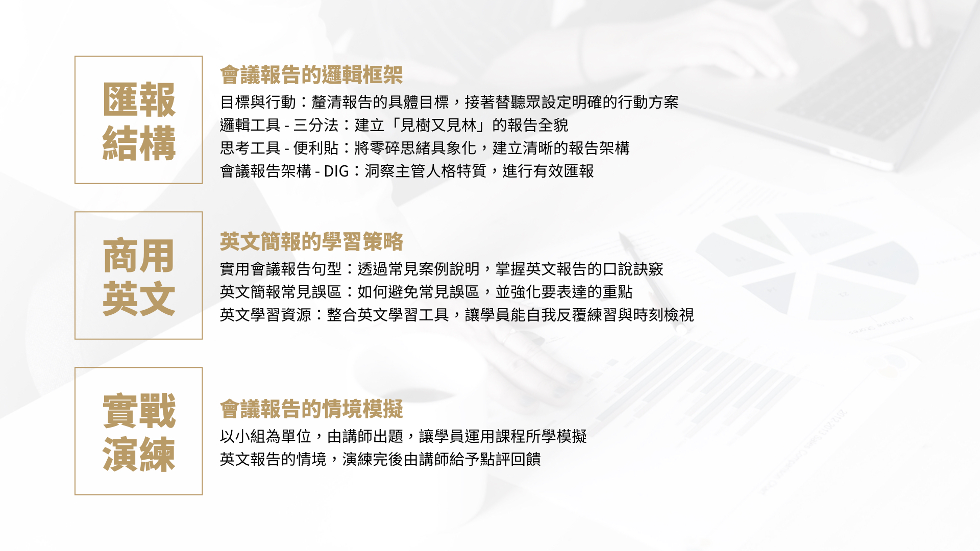 本次「英文匯報實戰攻略」主題內容,將由「匯報結構」、「商用英文」與「實戰演練」三個部分組成,拆解有效的匯報架構,結合實用的英文句型,讓學員能跨越語言的屏障,提升英文簡報能力,開啟多元化的國際溝通體驗。
