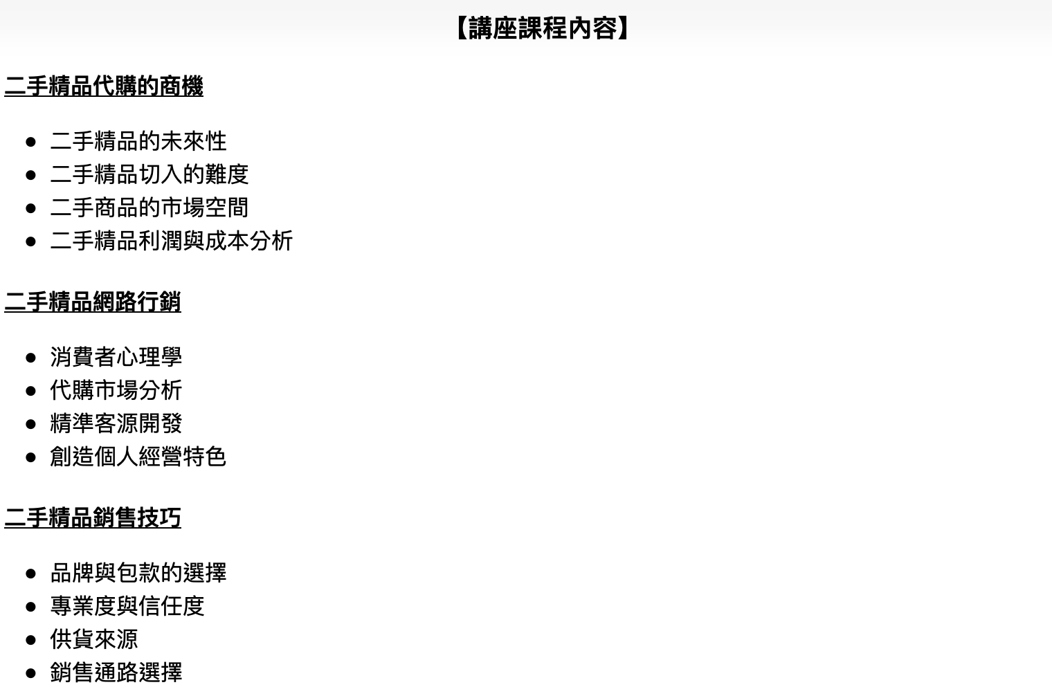 A:這堂課有分兩堂課,分別為上下午,上午場是日本代購的教學,下午場是二手精品代購,可以選擇自己有興趣的課程上,兩堂一起上會能了解更多代購專業喔!