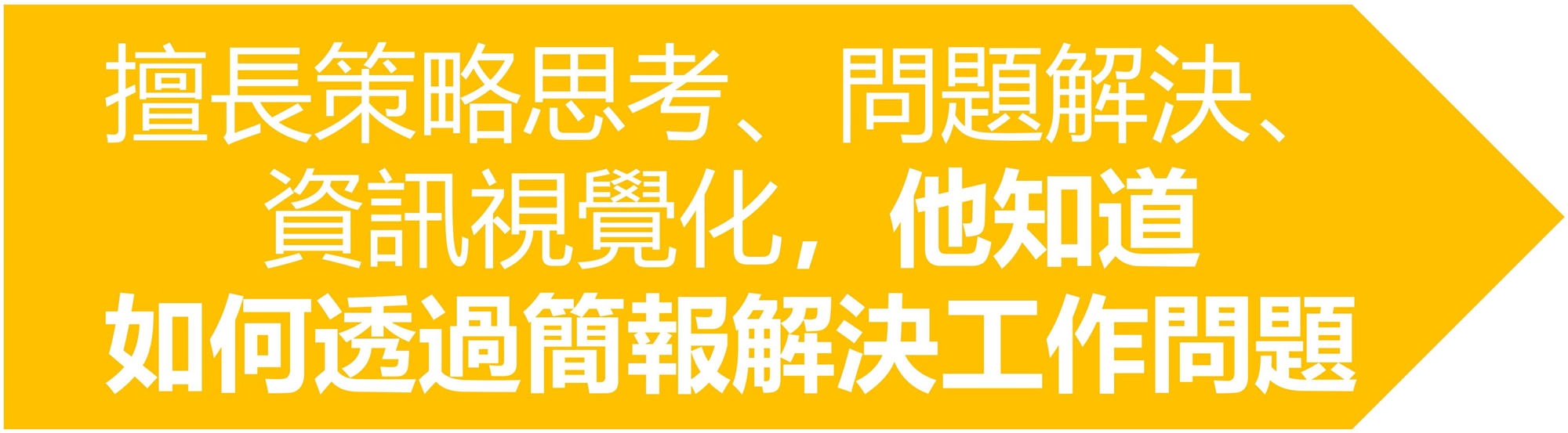 長期研究國際企業與研究機構簡報,並負責對公司高層的策略提案與對外部客戶的銷售簡報,投入在簡報領域鑽研的時間已超過三萬小時。