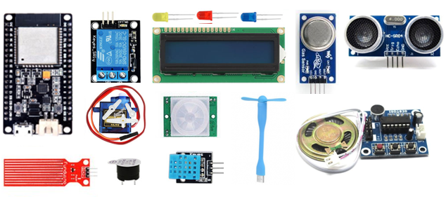 (贈送ESP32晶片及溫濕度、繼電器、人體紅外線、錄放音模組、瓦斯、水位、超音波、蜂鳴器、LED、USB風扇、1602 LCD等十多種常見感測器)