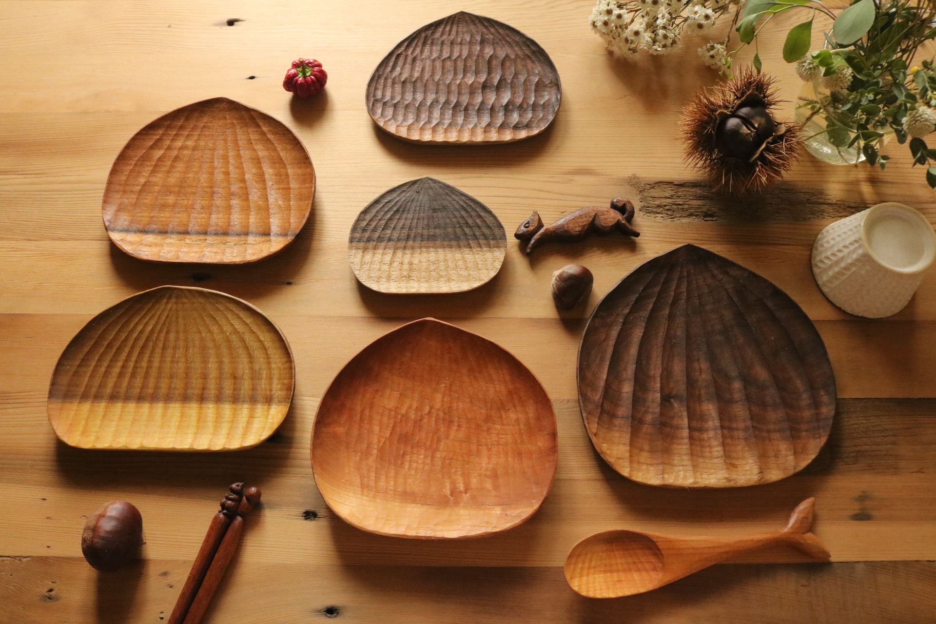 以胡桃木/櫻桃木/柚木…等等木色繽紛的木材,取其本身雙色部位,製作成可愛實用的手雕栗子盤,並搭配許多手工雕刻的技巧,讓作品更顯現手工製作的細緻感受。課堂上除了可以完成一件木盤作品,也能學到三種木器常見的雕刻裝飾技法,經典的六角紋/貝殼紋/水波紋,並介紹各種常用於食器的木材,食器專用塗裝方法,以及後續使用的保養說明,回家後只要有簡單的木工手工具,就可以在家自己製作各種造型的木盤囉!
