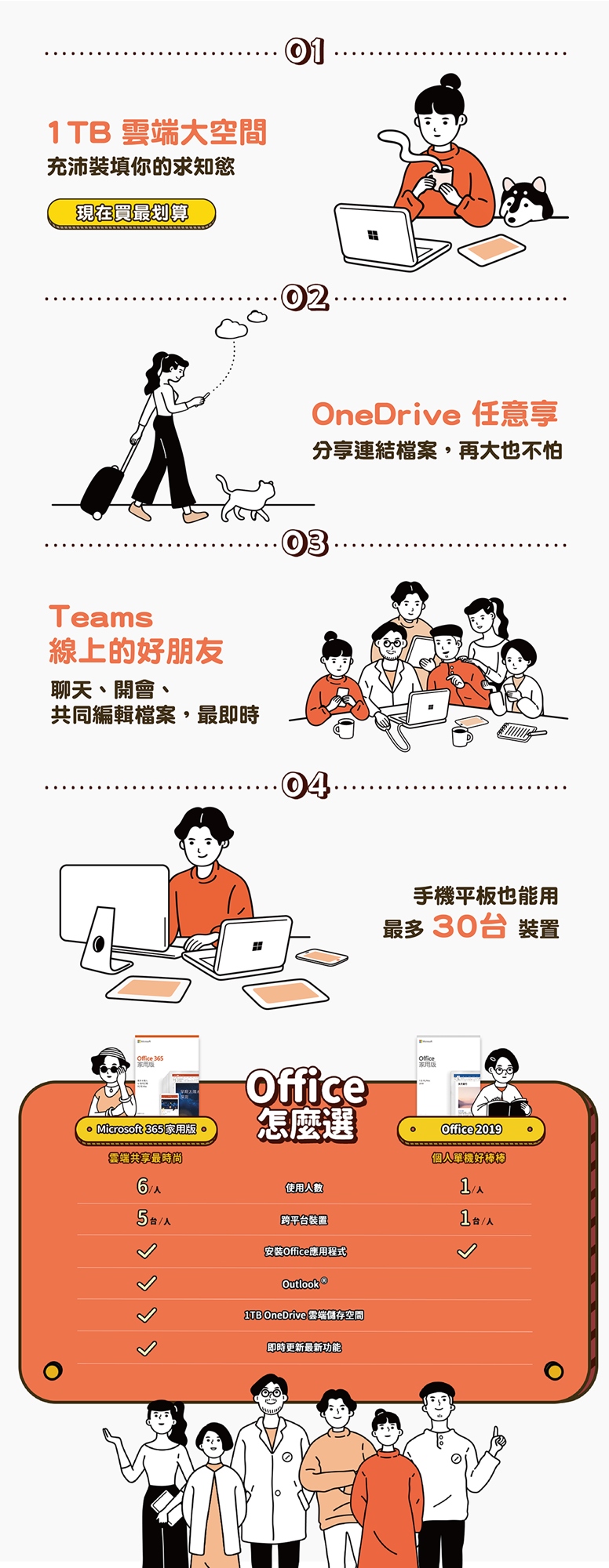 ※ 家用版及個人版皆包含 Microsoft 365 的:Office應用程式、Outlook、1TB OneDrive雲端儲存空間、即時更新最新功能。