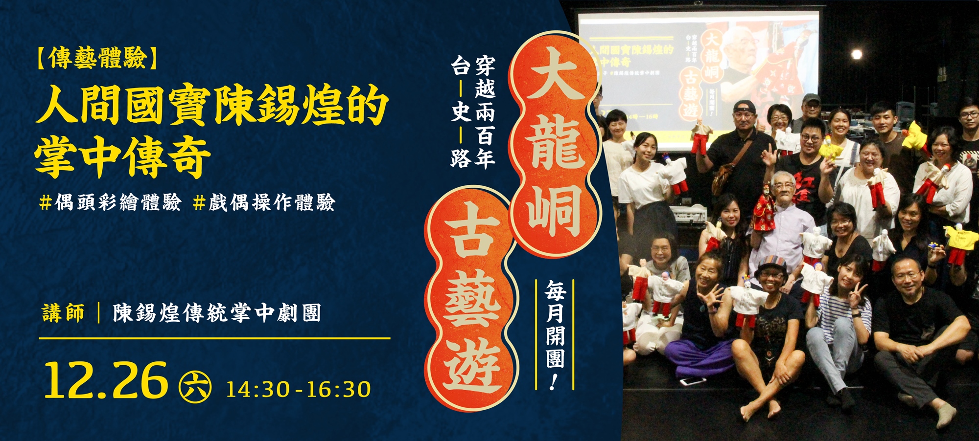 12/26 (六) | 人間國寶陳錫煌的掌中傳奇 | 陳錫煌傳統掌中劇團 | 布袋戲文化講座、戲偶操作體驗、戲偶彩繪體驗 | $500 |