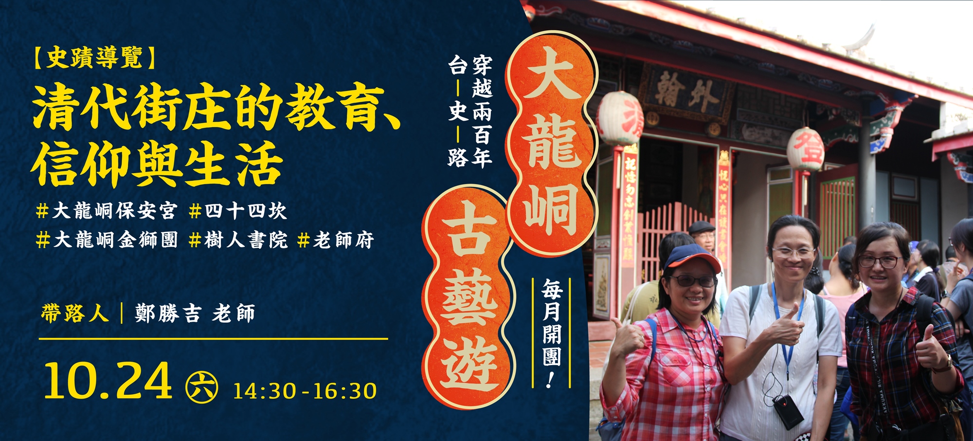 10/24 (六) | 清代街庄的教育、信仰與生活 | 鄭勝吉 | 大龍峒保安宮、四十四坎街、大龍峒金獅團、樹人書院、老師府 | $250 |