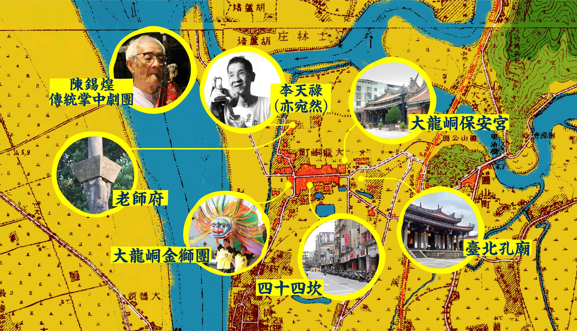 《大龍峒古藝遊》邀您和知名文史走讀達人、國寶傳藝團隊一起進入時光隧道!深度探索四十四坎街 / 大龍峒保安宮 / 老師府陳悅記宅邸 / 大龍峒金獅團 / 台北孔廟 / 亦宛然掌中劇團 / 陳錫煌傳統掌中劇團,找尋「台北市街」歷經兩百多年變與不變的城市印記。