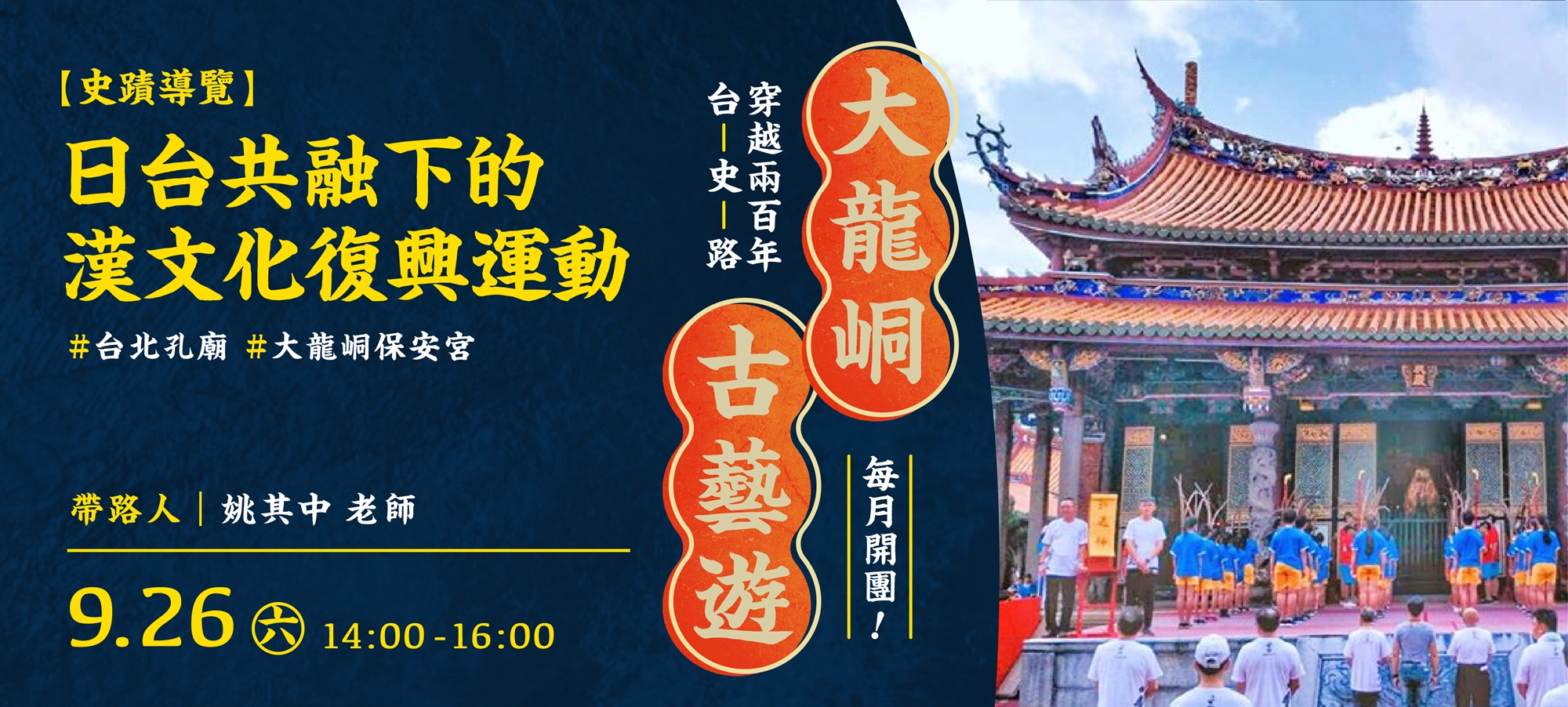 9/26 (六) | 日台共融下的漢文化復興運動 | 姚其中 | 台北孔廟、大龍峒保安宮 | $250 |