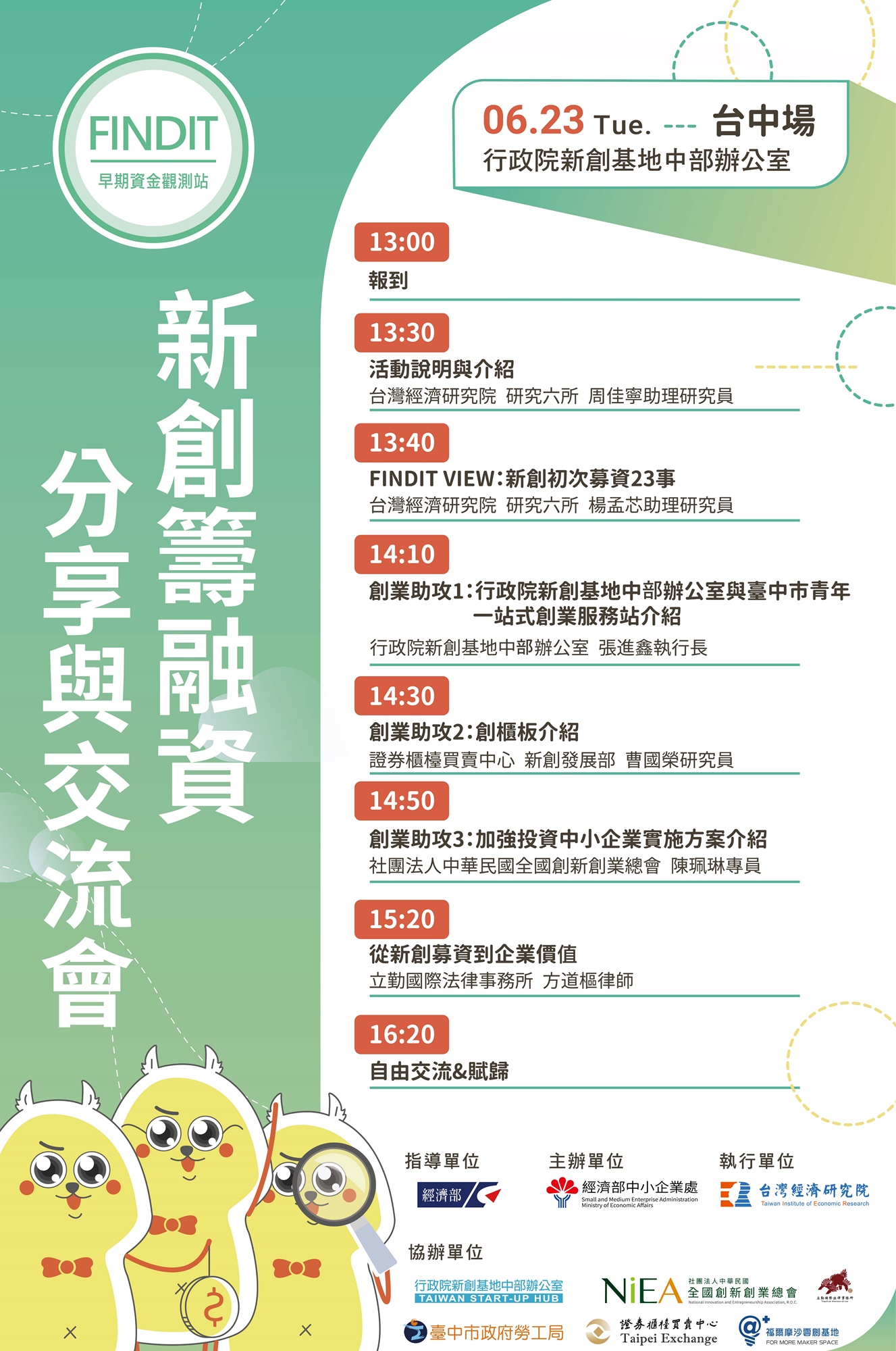 地點:行政院新創基地中部辦公室(台中市中區綠川西街135號13F,東協廣場B棟7號電梯直達13樓)