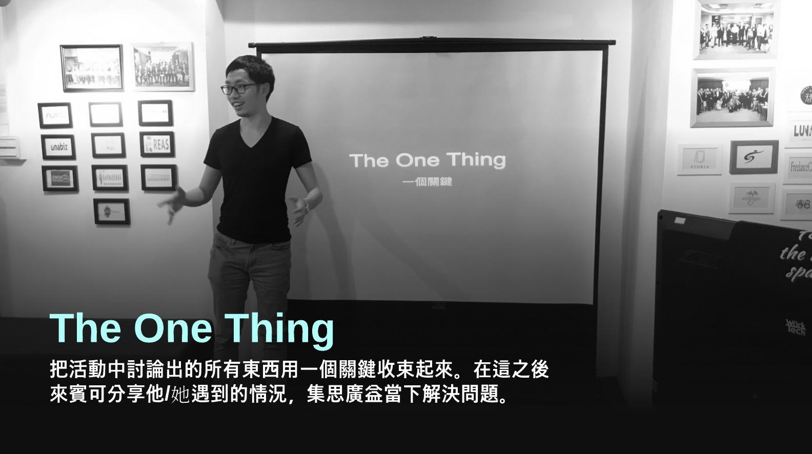 把活動中討論出的所有東西用一個關鍵收束起來。在這之後來賓可分享他/她遇到的情況,集思廣益當下解決問題。