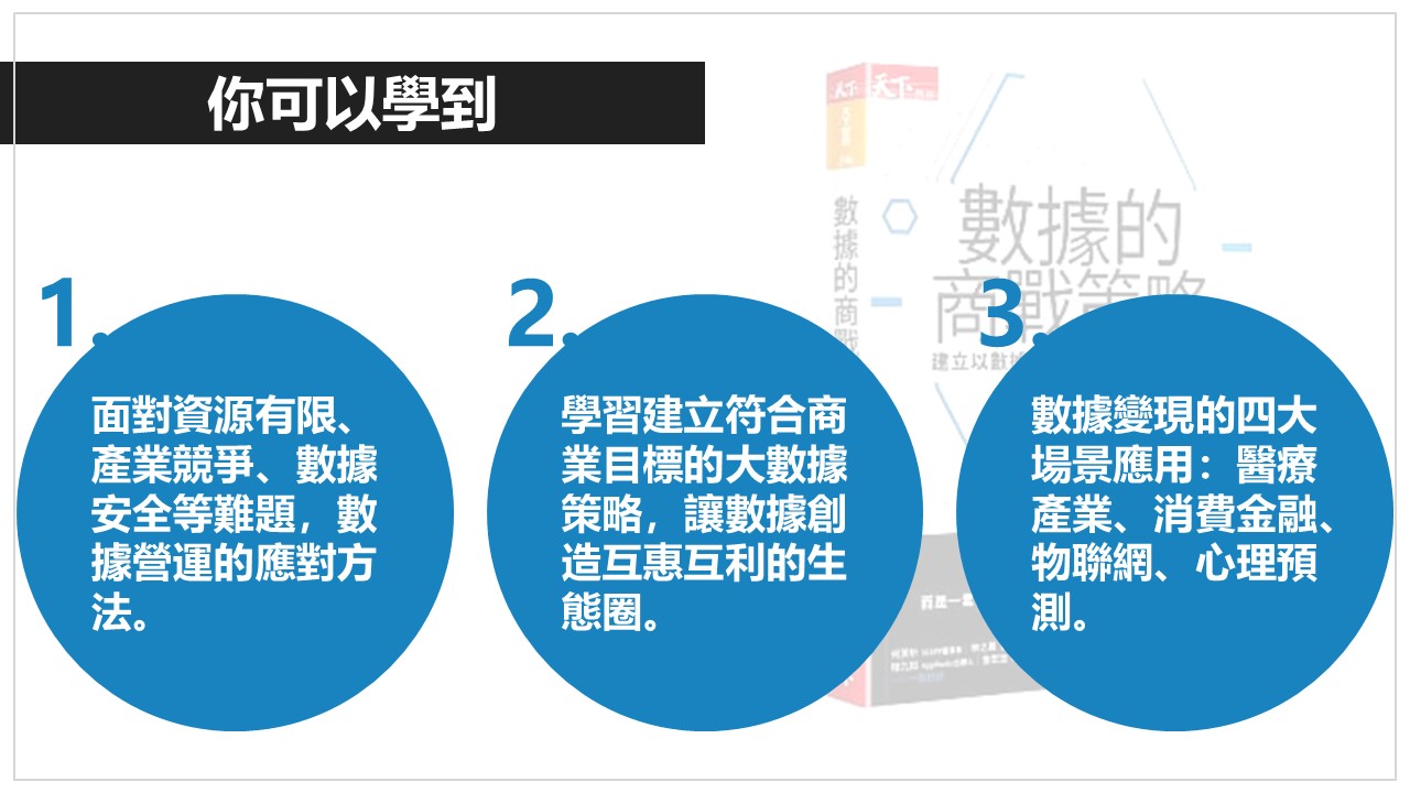 並介紹醫療、金融、零售、娛樂等多種產業,如何發揮對數據策略的想像,透過不同領域的數據結合,讓外部數據彌補內部業務的盲點,實現數據變現。