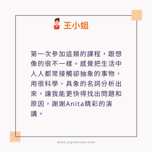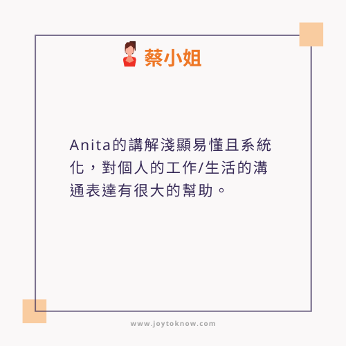 ➲ Anita企業教練,累積一對一諮商輔導超過數千小時,熱衷於知識培訓、人才養成、教練人們輕鬆運用所學、享受學習的樂趣,並進一步優化生活、工作與企業管理,已經協助超過千人,完成目標實現夢想。
