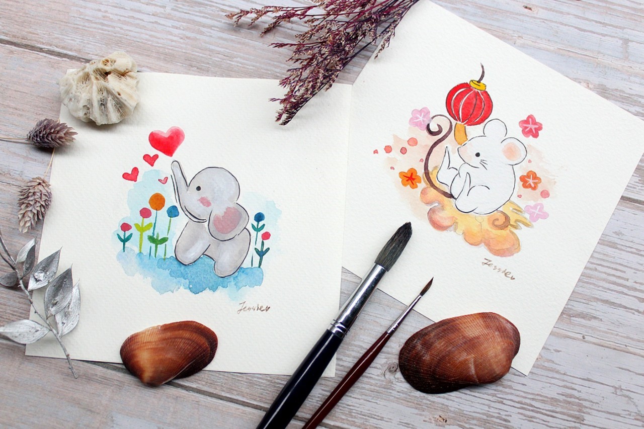 水彩畫令人著迷的一個原因,由於色彩透明,一層顏色覆蓋另一層可以產生特殊的效果,但如果調和顏色過多,反而會有過多的暈染喔,也因此水彩畫比較適合小幅作品,效果也會比大幅來的好喔!此課程老師會設計多款可愛動物,有今年是鼠年的老鼠,大象,長頸鹿,獨角獸...等,想要來發現可愛動物,快點來上課吧!