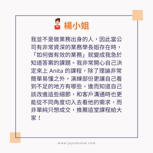- 實際演練符合個人的銷售狀況,讓你能夠隨學隨用