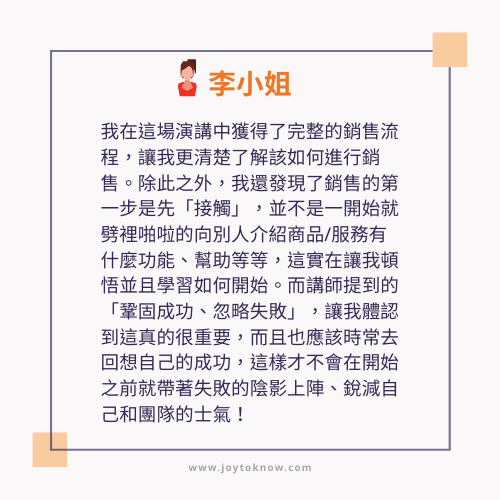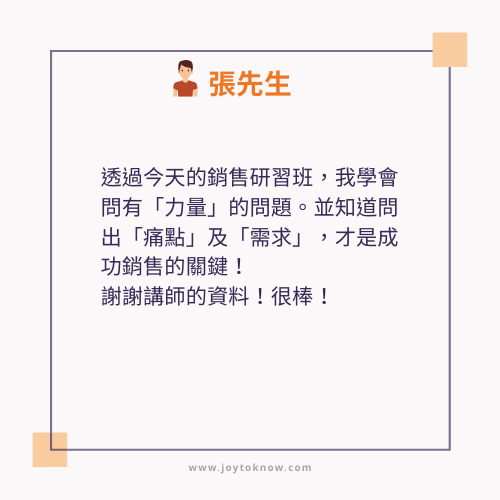 - 運用明確架構式說明,讓學員可以很容易學會銷售技巧