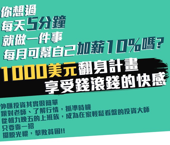 每天五分鐘,就做一件事情,幫自己加薪!外匯投資很簡單,找對老師、抓準時機,成為投資好手。我們不追求不切實際的翻倍,相反的我們希望每位來賓都能在研討會獲得實用的技巧,達到穩健獲利!