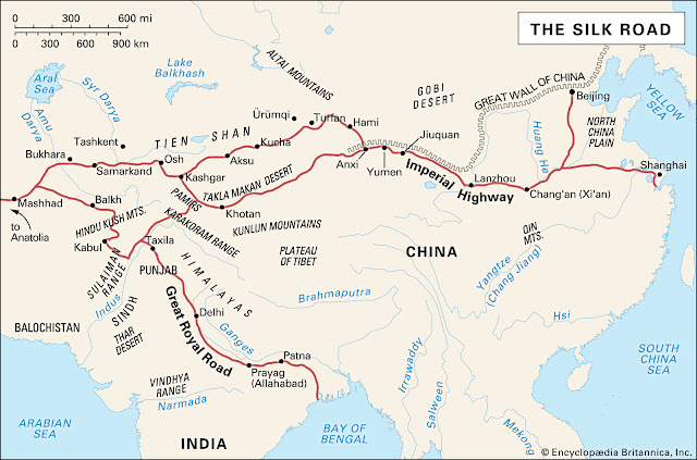 西漢期間由張騫出使西域開闢、以長安(今西安)為起點,經甘肅、新疆,到中亞、西亞,並聯結地中海各國的陸上通道。因此路西運的貨物裡以絲綢製品為最大宗,故得此名。