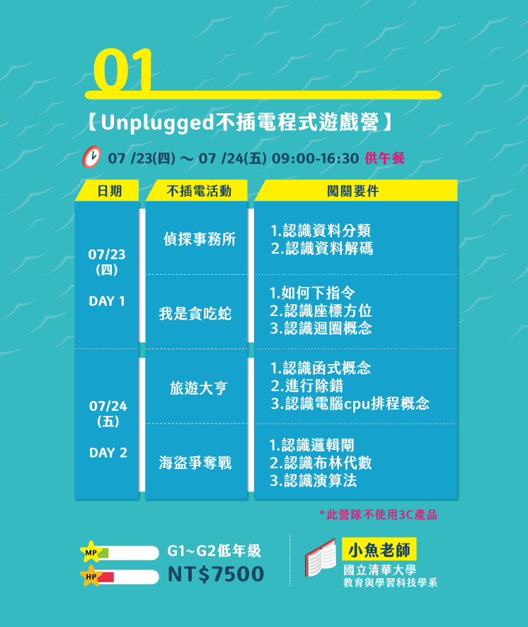 - 課程不使用3C產品,採用不插電的程式遊戲教學活動,運用繪畫、卡牌遊戲、情境包裝、團體指令、程式桌遊,讓低年級孩子學習程式概念,培養邏輯思考、運算思維和解決問題的能力。