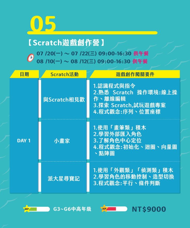 梯次一:7/20(一)~7/22(三) 09:00~16:30 三日營