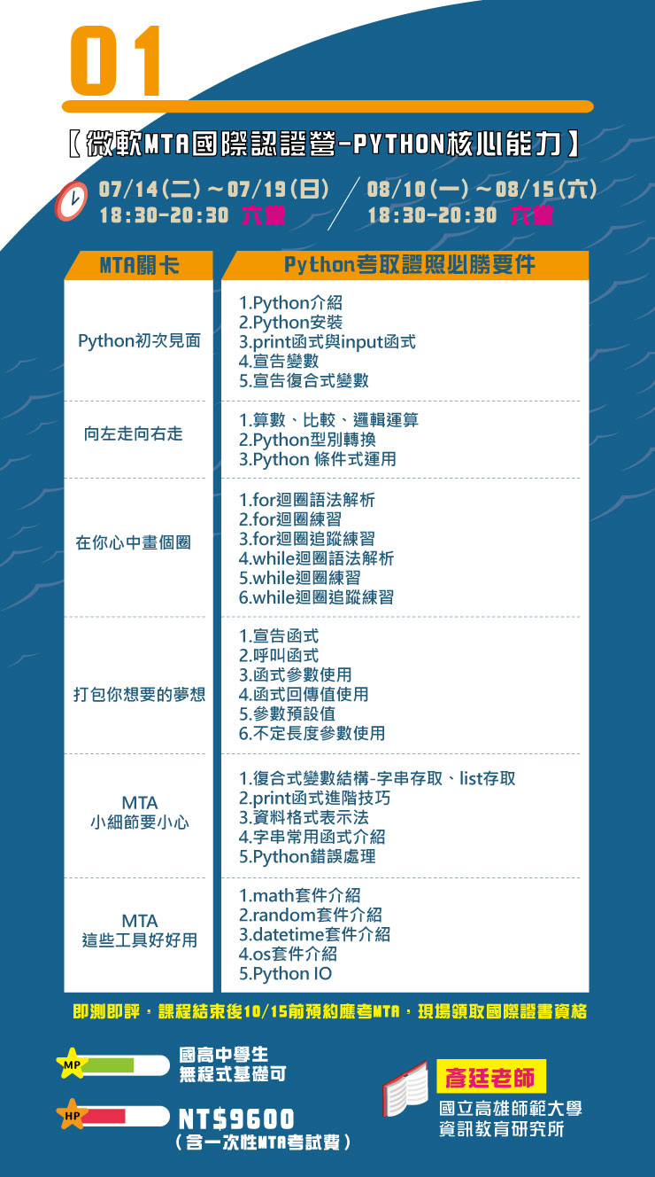 >> 課程可學習PYTHON基礎概念,課程結束可預約時間在寰宇南京復興校教室應考MTA PYTHON,即測即評,現場領取MTA微軟授權證書。