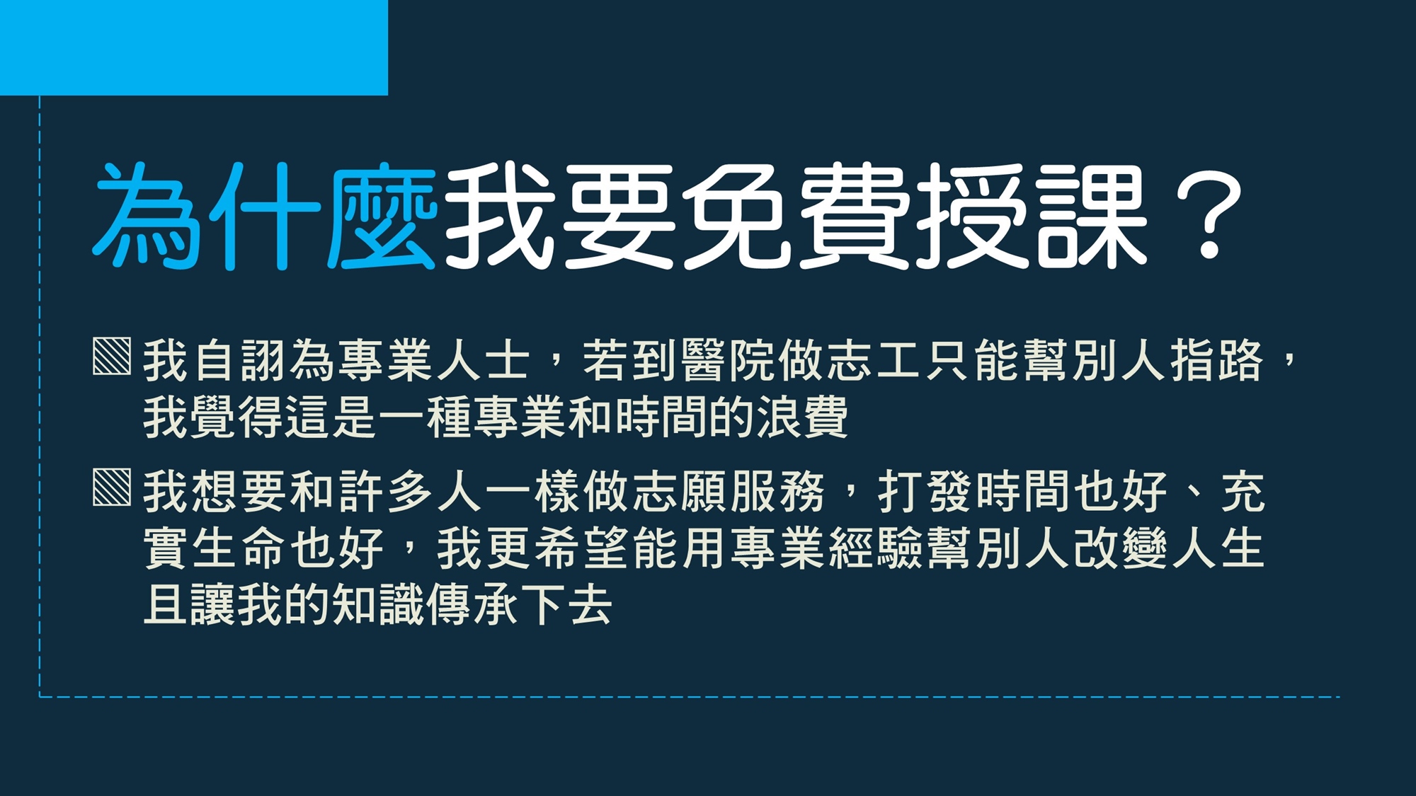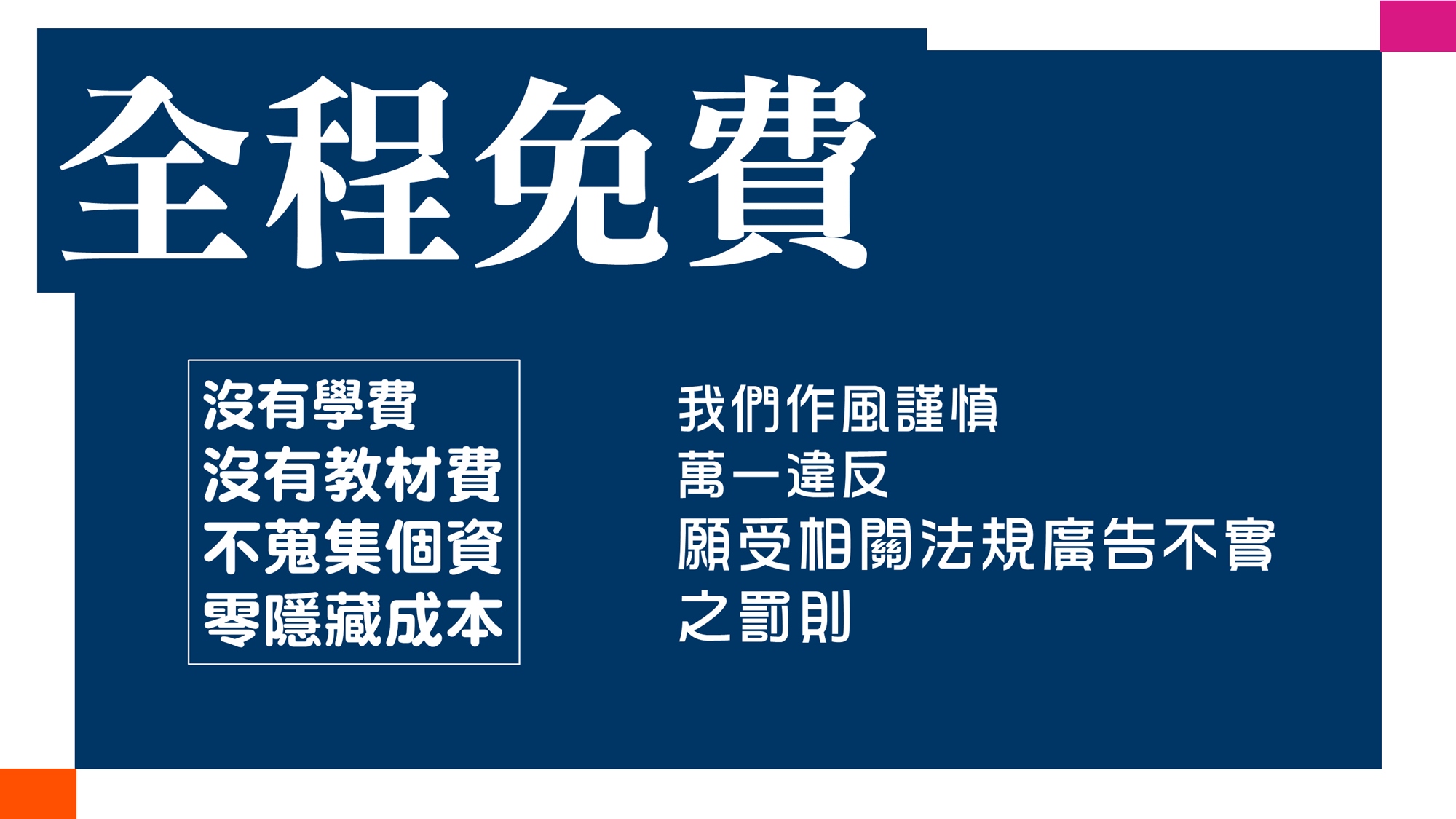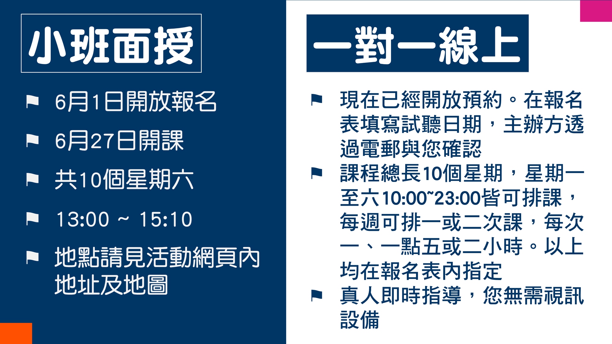 適合對象與試聽適合TOEIC聽讀成績未達595分的英語學習者試聽與正式課程全程免費試聽的目的是讓您評估講師的授課方式、內容及態度是否值得您繼續參與為期數個月的免費正式課程;講師不會勉強,決定權操之在您試聽時間比正式課程短且沒有現場練習機會,而是講師單向解說課程進行方式,節奏會比正式課程快一些(試聽偏重解釋方法與步驟;正式課程較詳細而且有相當多的練習與應用機會