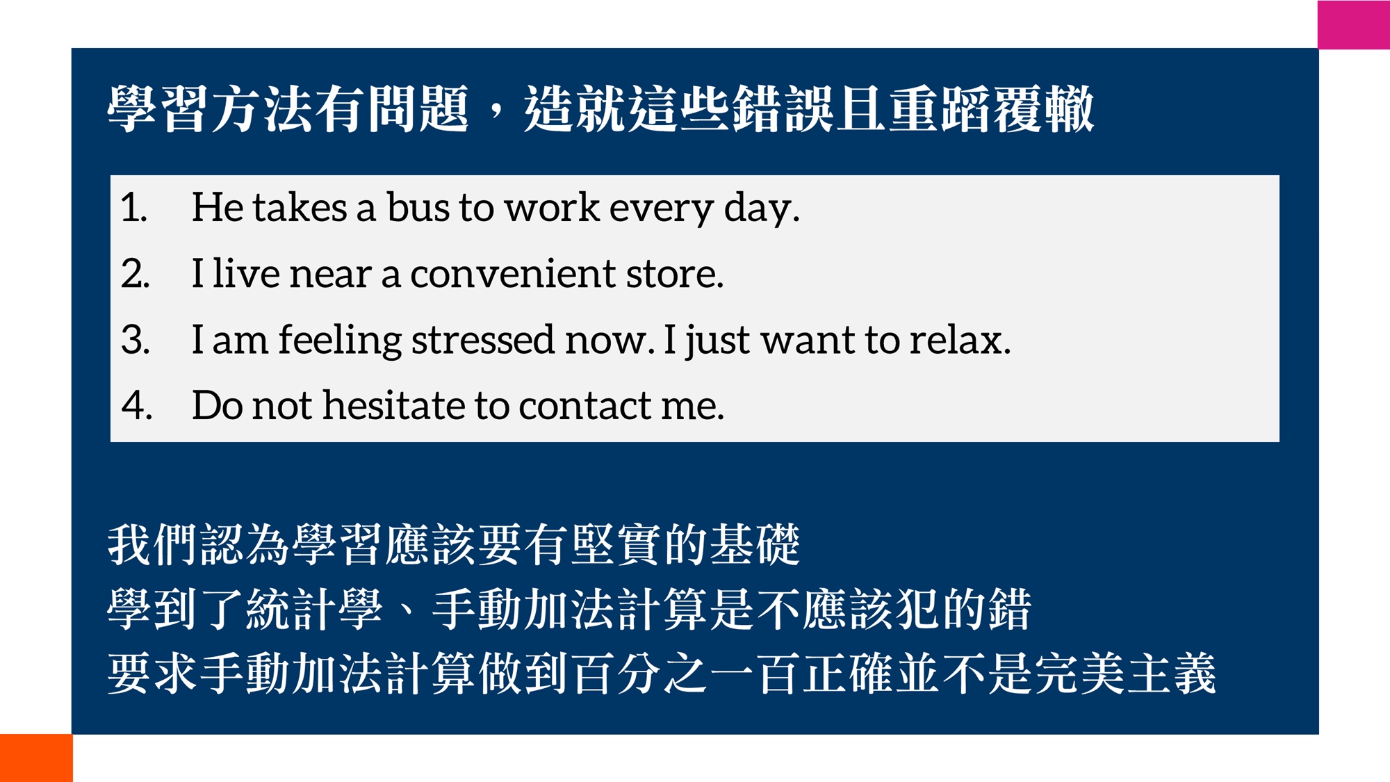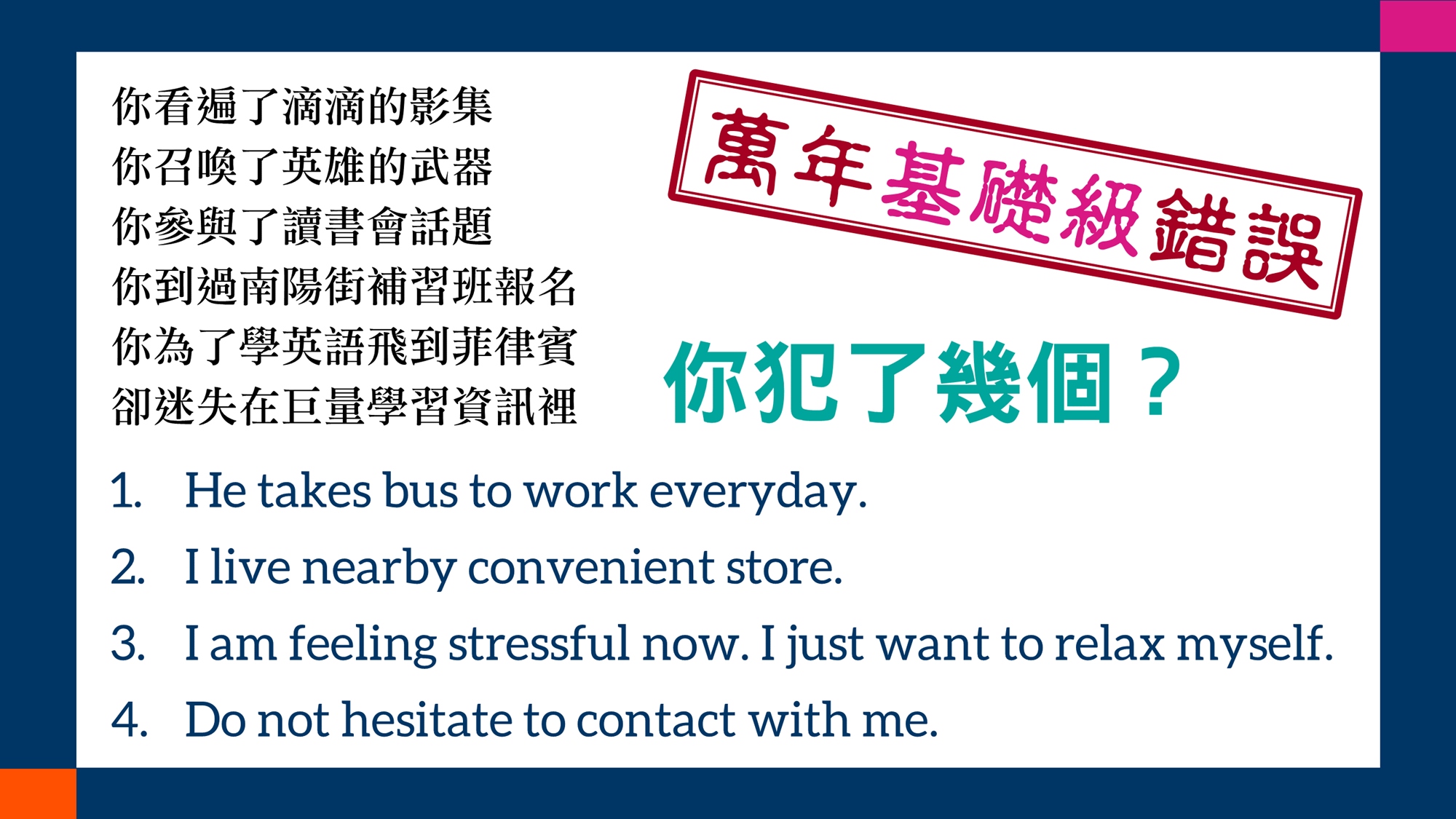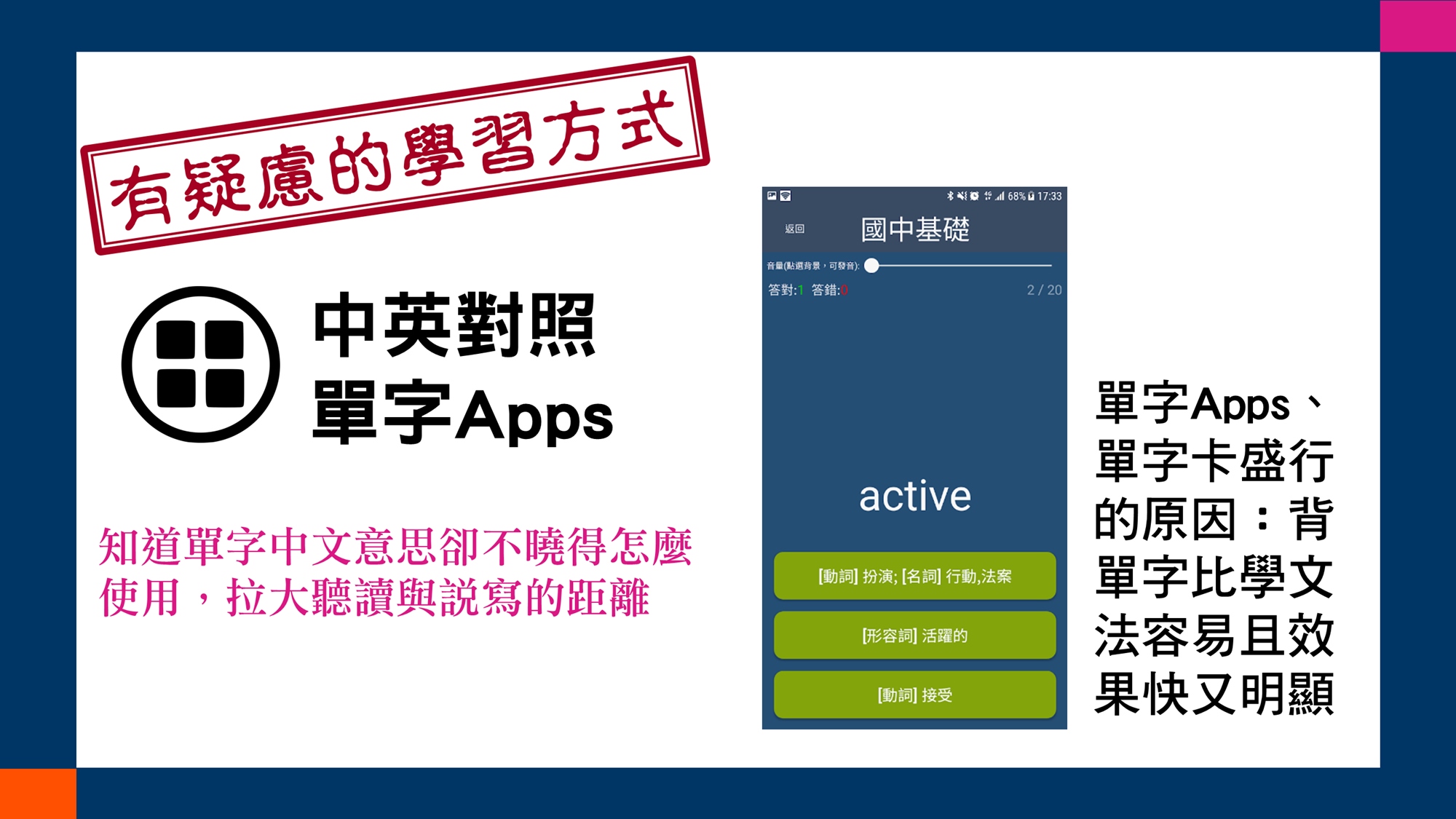 適合對象與試聽適合TOEIC聽讀成績未達595分的英語學習者試聽與正式課程全程免費試聽的目的是讓您評估講師的授課方式、內容及態度是否值得您繼續參與為期數個月的免費正式課程;講師不會勉強,決定權操之在您試聽時間比正式課程短且沒有現場練習機會,而是講師單向解說課程進行方式,節奏會比正式課程快一些(試聽偏重解釋方法與步驟;正式課程較詳細而且有相當多的練習與應用機會