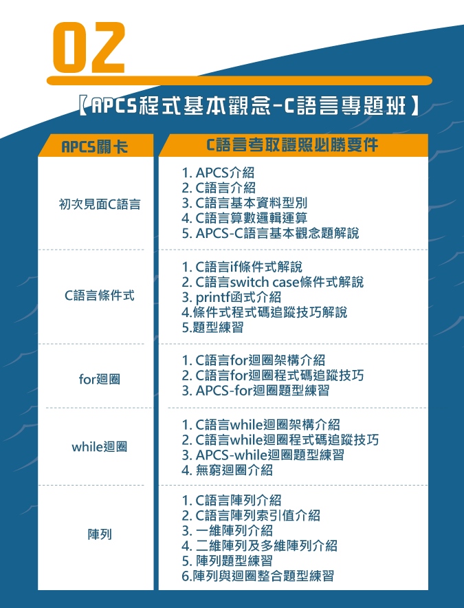 APCS程式檢定基本觀念以C語言為主,而程式實作可運用C、C++、PYTHON、JAVA作答,所以無論學習哪一種程式語言,對孩子的邏輯思考以及未來想朝資工發展都有益處。