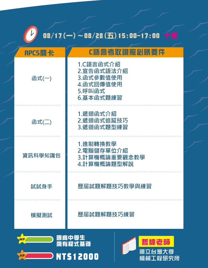 梯次一:8/17~8/28 週一至週五 15:00~17:00 十堂課