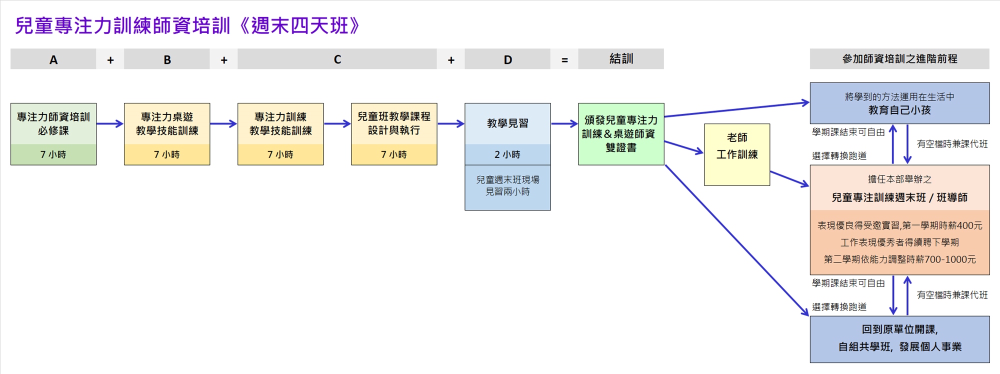 1. 受訓學員參加『兒童專注力訓練師資班』訓練課程+見習,全程完成訓練後,由社團法人專注力訓練推廣協會頒發兩張結業證書「兒童專注力桌遊師資」及「兒童專注力訓練師資」雙證書。