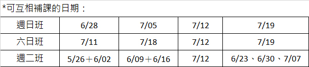 *報名各班的學員如果有某天因事不能上課,可請假到別班補課,補課限本期的班補完。