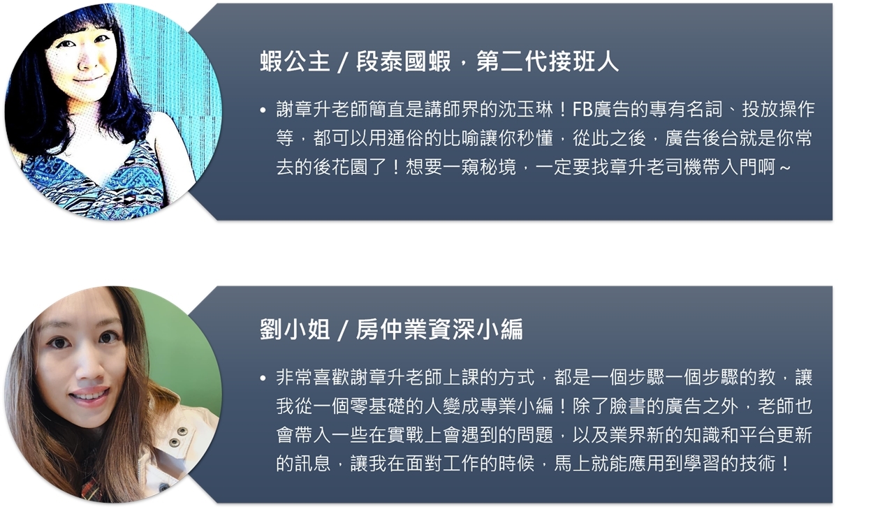 本次課程,邀請到活躍於兩岸三地網路圈的資深顧問謝章升,前來指導大家掌握Facebook廣告特性與受眾設定,並進一步藉由數據了解到自己的廣告、銷售頁或產品到底哪邊做對或做錯,進而有效提升自己的業績。